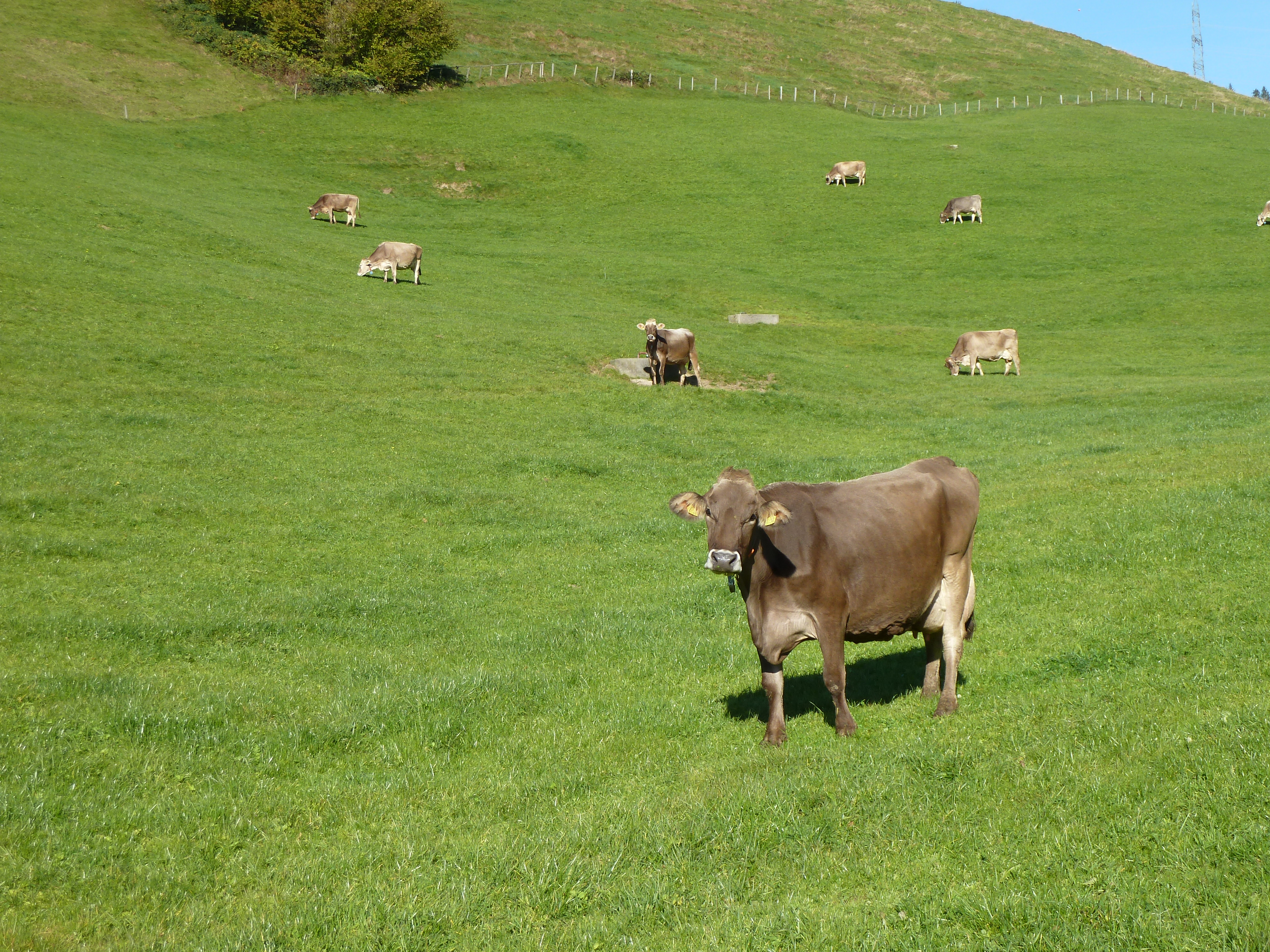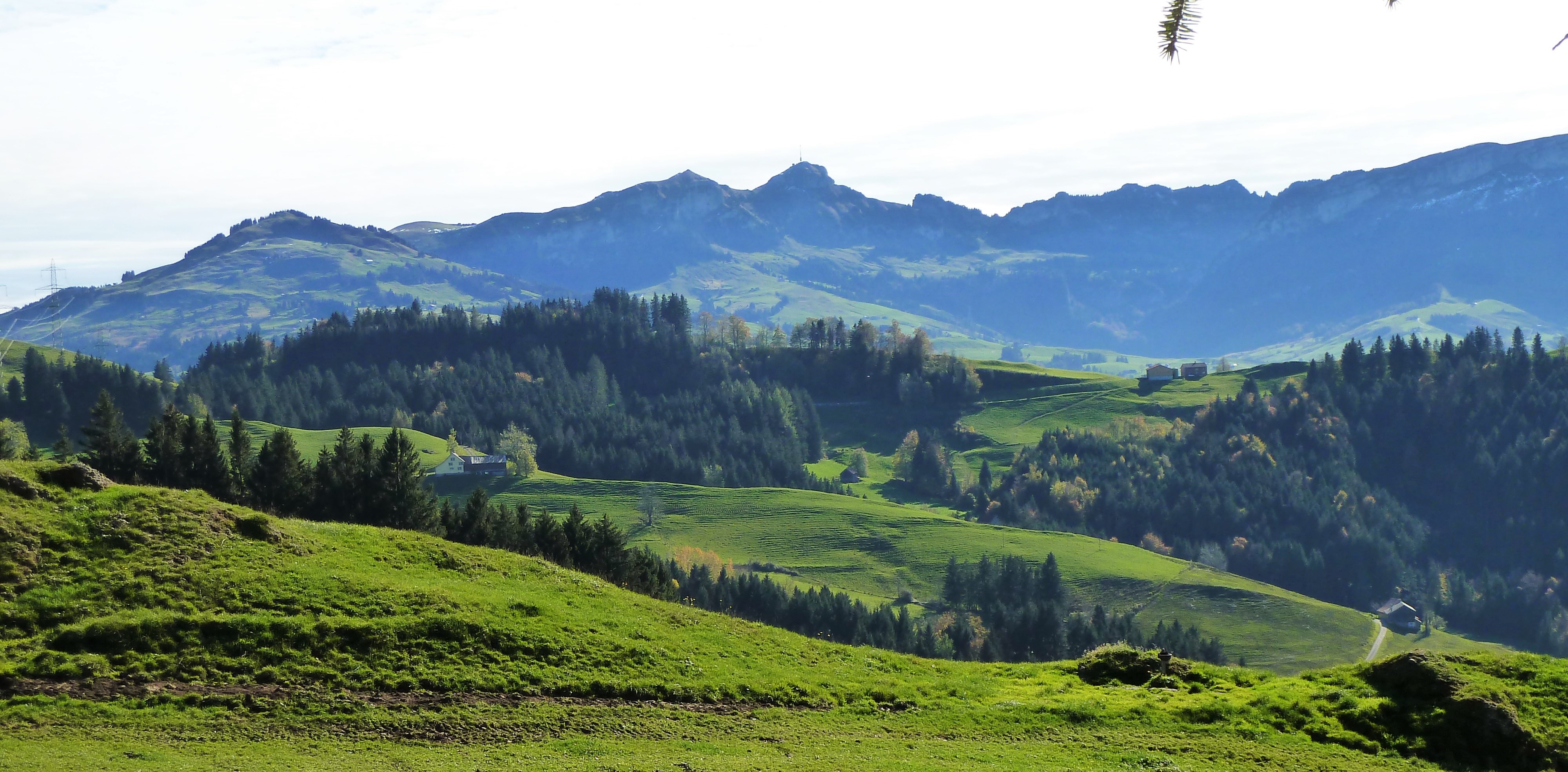 Hier in den hügeligen Voralpen trifft man eine idyllische Landschaft an. Unsere Wanderroute verlief auf der Sonnenseite und war sehr wenig begangen. Vielleicht weil man sich aus dem Rucksack bedienen muss und auch kein Spielplatz vorhanden ist.