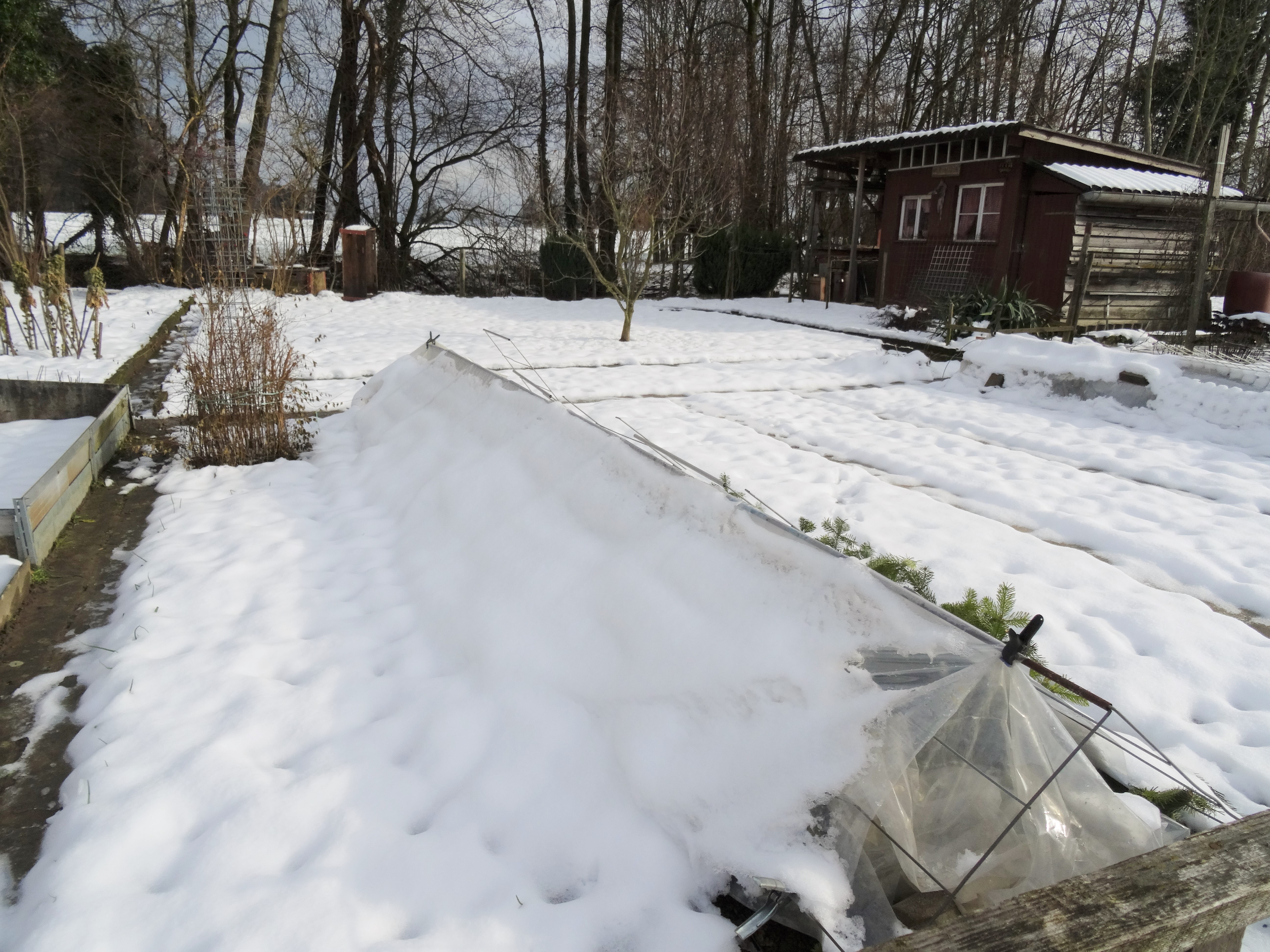 Noch liegt eine dünne Schicht Schnee über den Beeten und lässt die Natur ruhen. Es kommt längst nicht alle Jahre vor, dass bei uns im Flachland die weisse Pracht liegen bleibt. Unter dem Plastik wartet der letzte Zuckerhut auf den Verzehr. Den Rosenkohl konnten wir nicht mehr allen ernten, da die Temperaturen um den Jahreswechsel zu tief waren. Aber mit Verlust muss man halt immer rechnen.