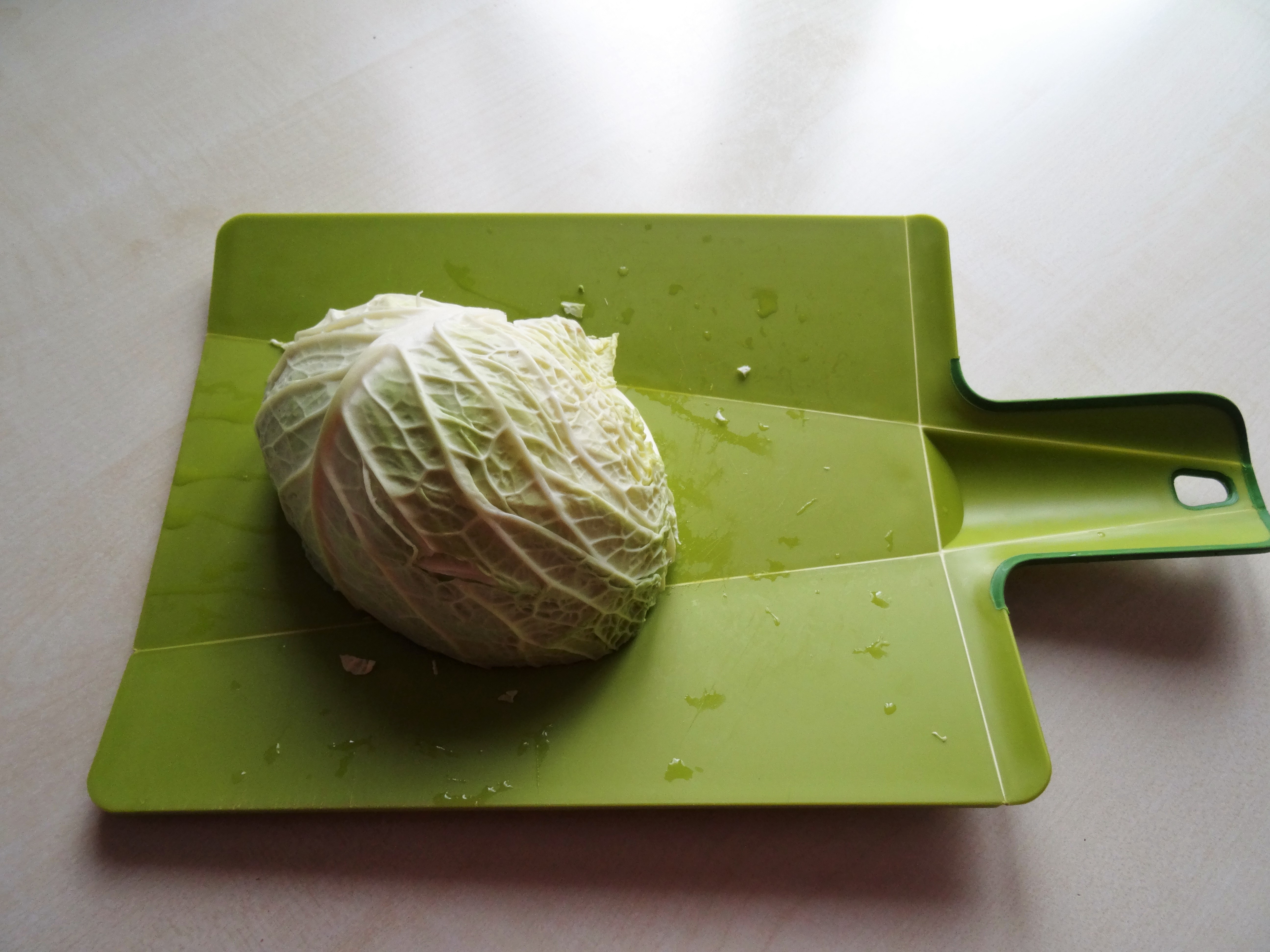 Man braucht dafür: einen Kohl, Brot vom Vortag und Speckwürfeli.