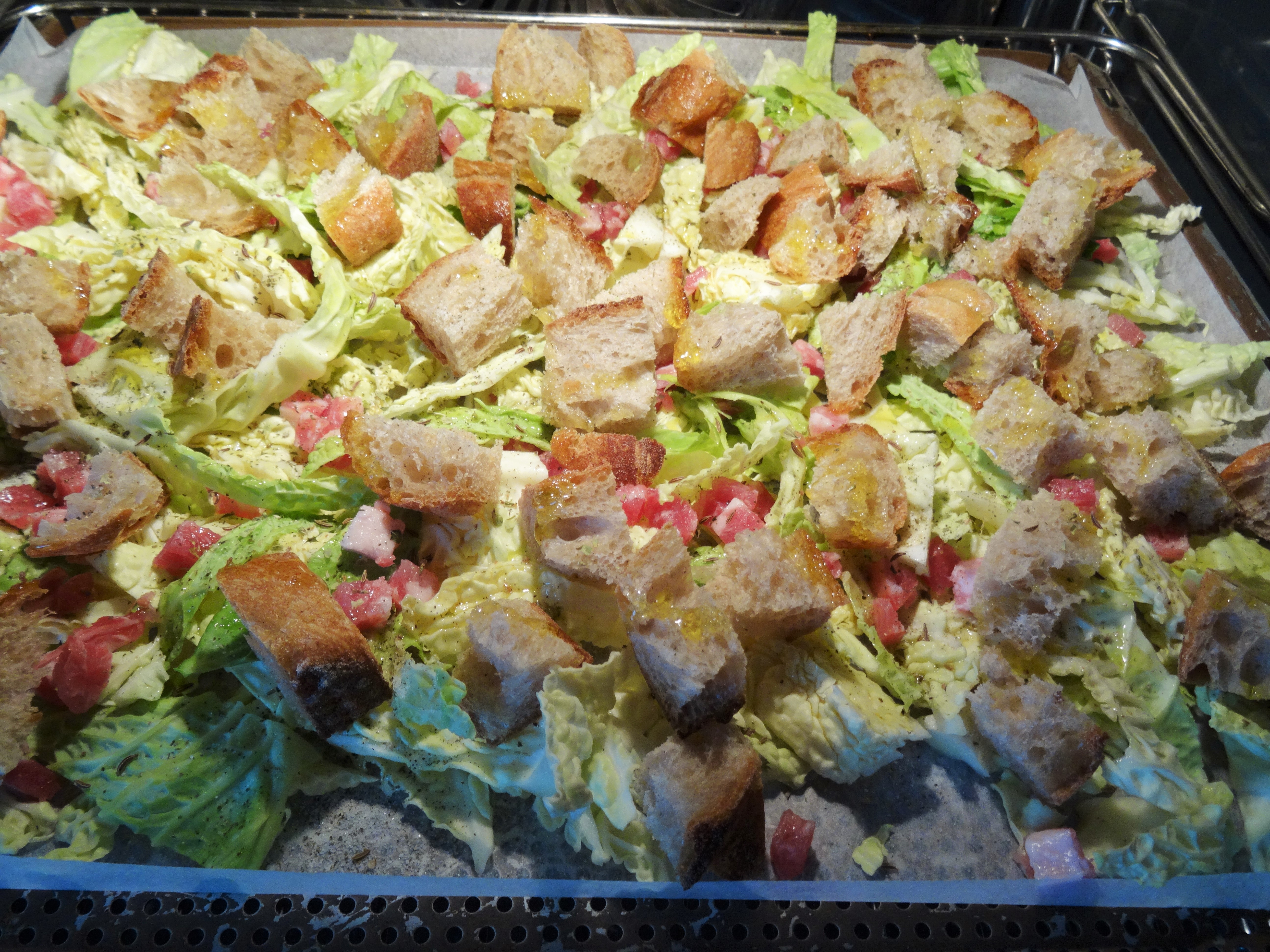 Den Kohl ohne Strunk in Streifen schneiden. Das Brot in kleine Würfel schneiden und beides auf ein Backpapier legen. Mit Salz und Pfeffer würzen. Ich habe noch ganz wenig Kümmel dazu gegeben. Mit Olivenöl beträufeln und die Speckwürfel dazugeben. Das ganze bei 200° Grad im Ofen, ca. 20 -30 Min. mit Intervall backen.