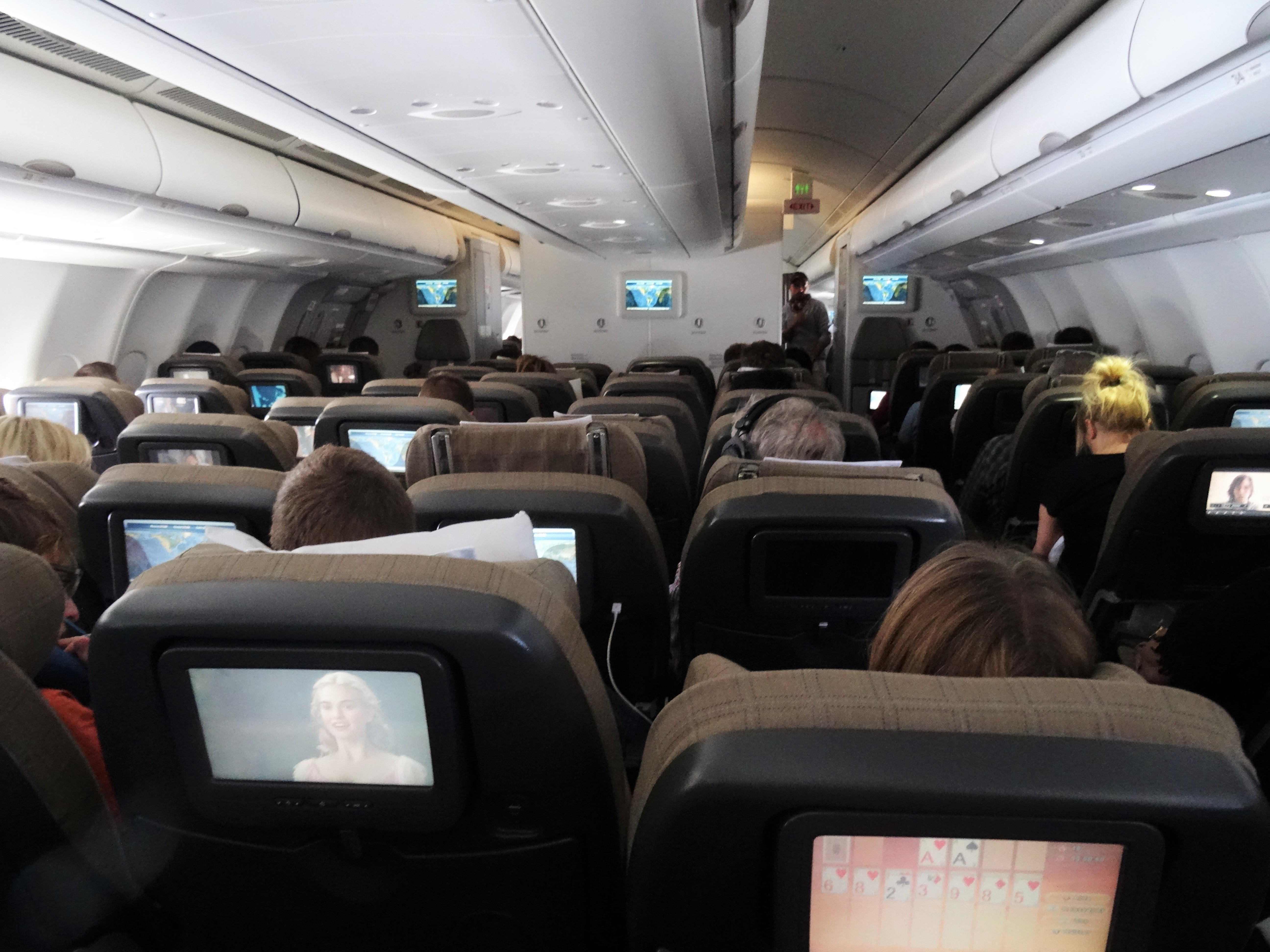 Als ich Anfang Juli hoch oben in den Lüften weilte, wusste ich noch nichts von Lottas Themenvorschlag. Doch aus lauter Langeweile knipste ich ein paar Bilder. Schaut man auf die einzelnen Bildschirmen, kann man beobachten wer sich mit was die Zeit totschlägt.