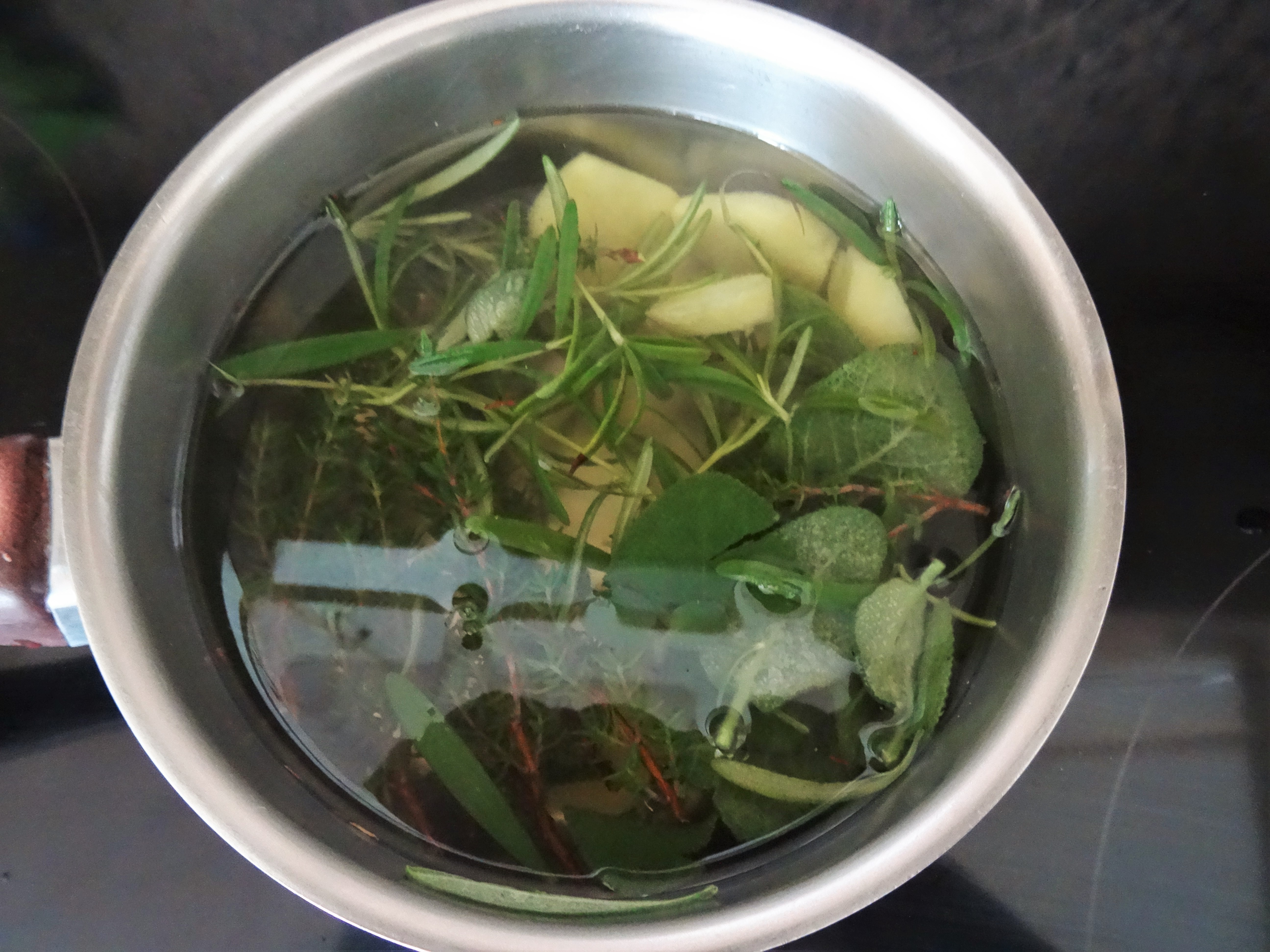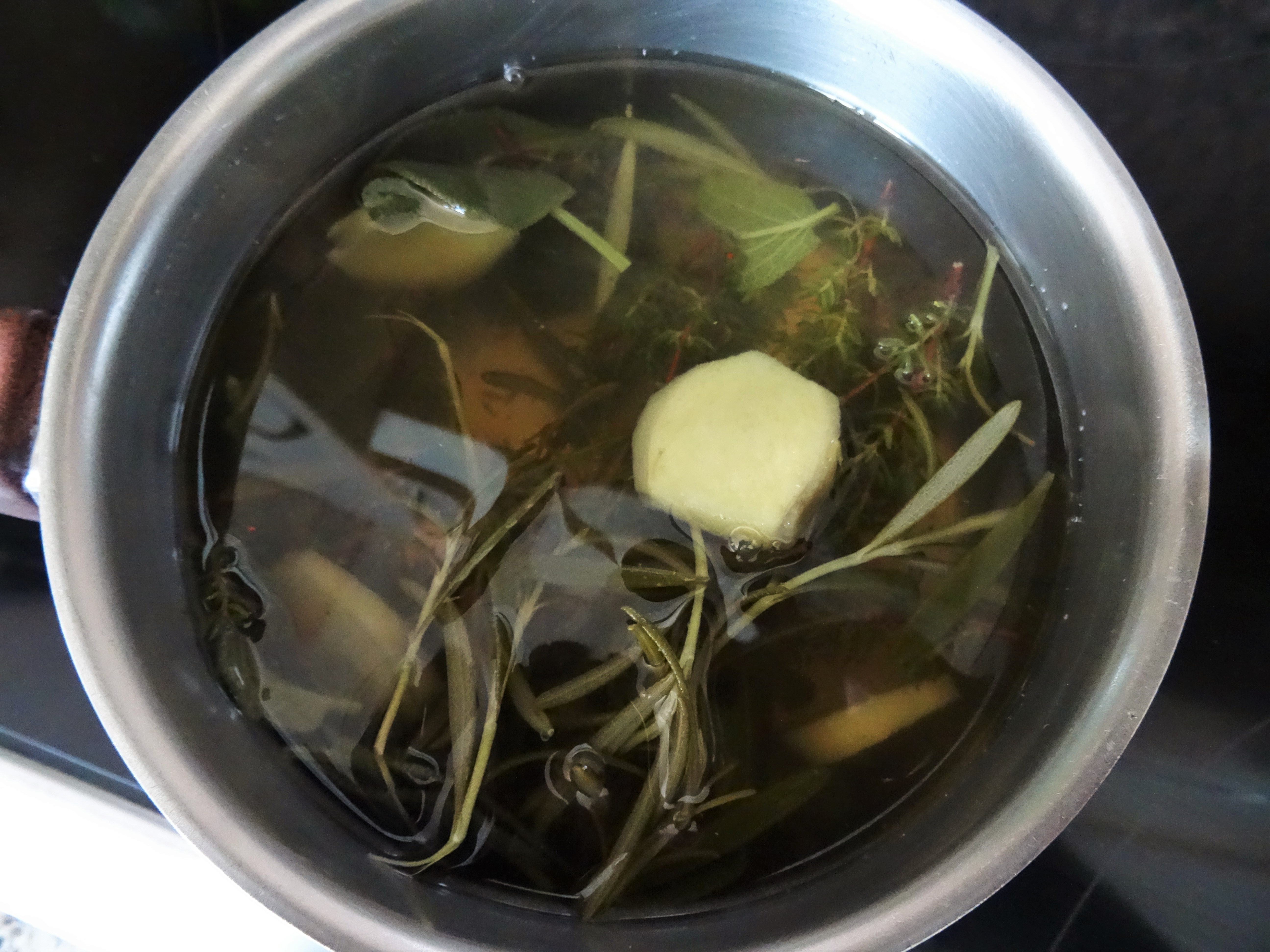 Die Kräuter waschen und kalt ansetzen mit Wasser. Das Wasser bis kurz vors Kochen bringen und in der zugedeckten Pfanne ziehen lassen.