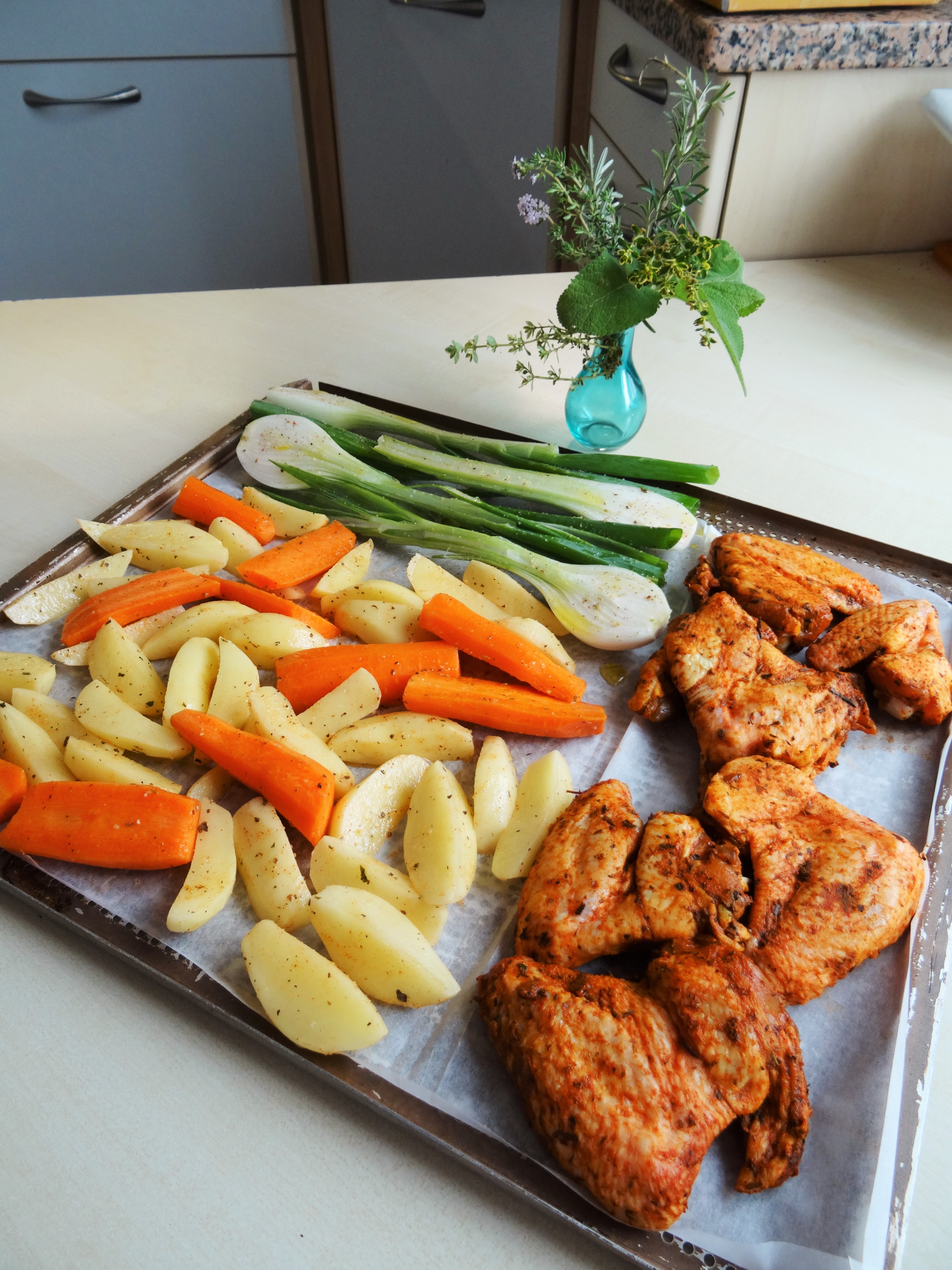 Die Kartoffeln in Schnitze schneiden, das Gemüse, je nach Saison Karotten, Sellerie, Kürbis, Randen oder Frühlingszwiebeln, ebenfalls in Stücke schneiden. In einer Schüssel würzen und mit wenig Oel gut mischen und auf ein mit Backtrennpapier belegtes Blech verteilen. Rosmarin- und Thymianzweige darauf verteilen