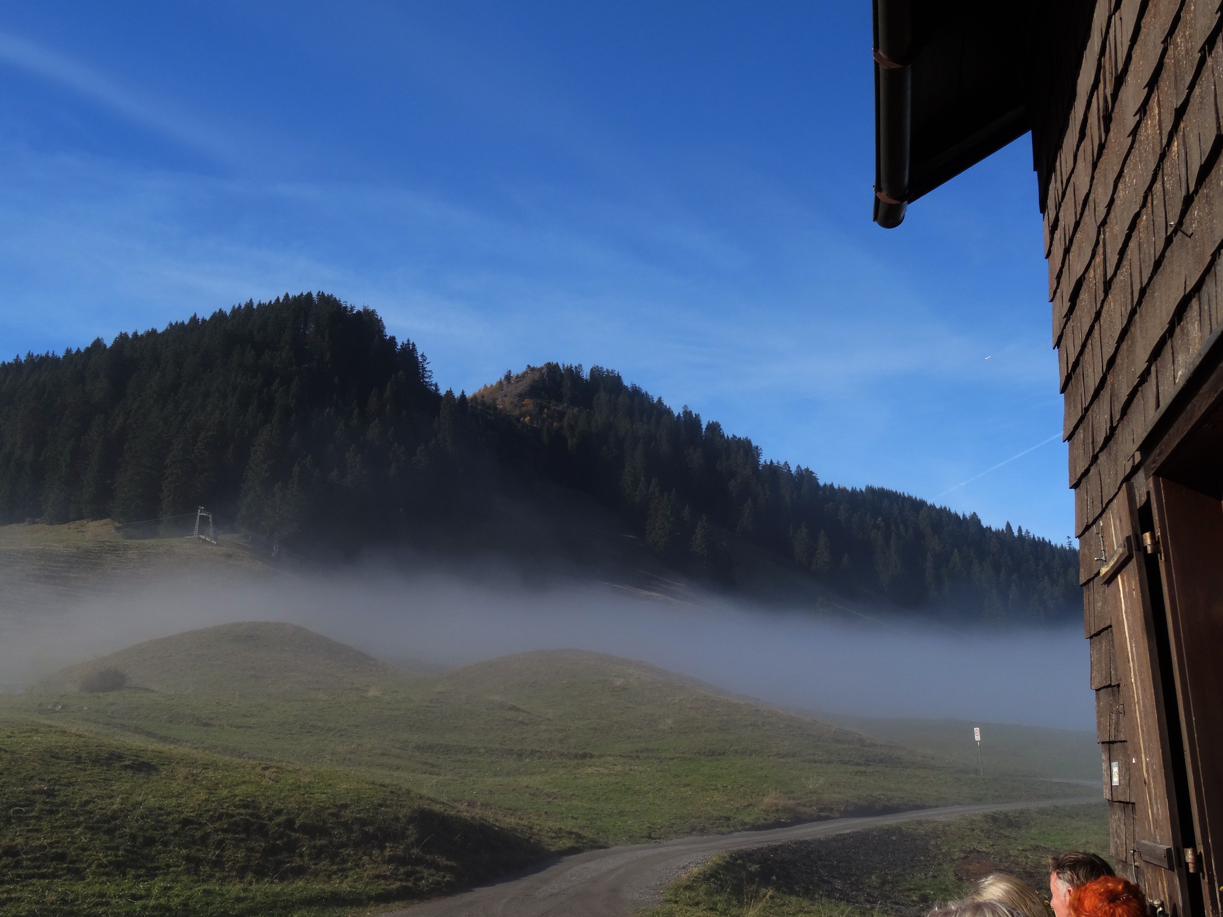 Pause machen in einer Hütte, die auch im November noch für Gäste offen hat, sich an die Hauswand setzten, von der Sonne wärmen lassen und die Nebelschwaden den Hang hinauf ziehen lassen, das ist so, wie ich es gerne mag.