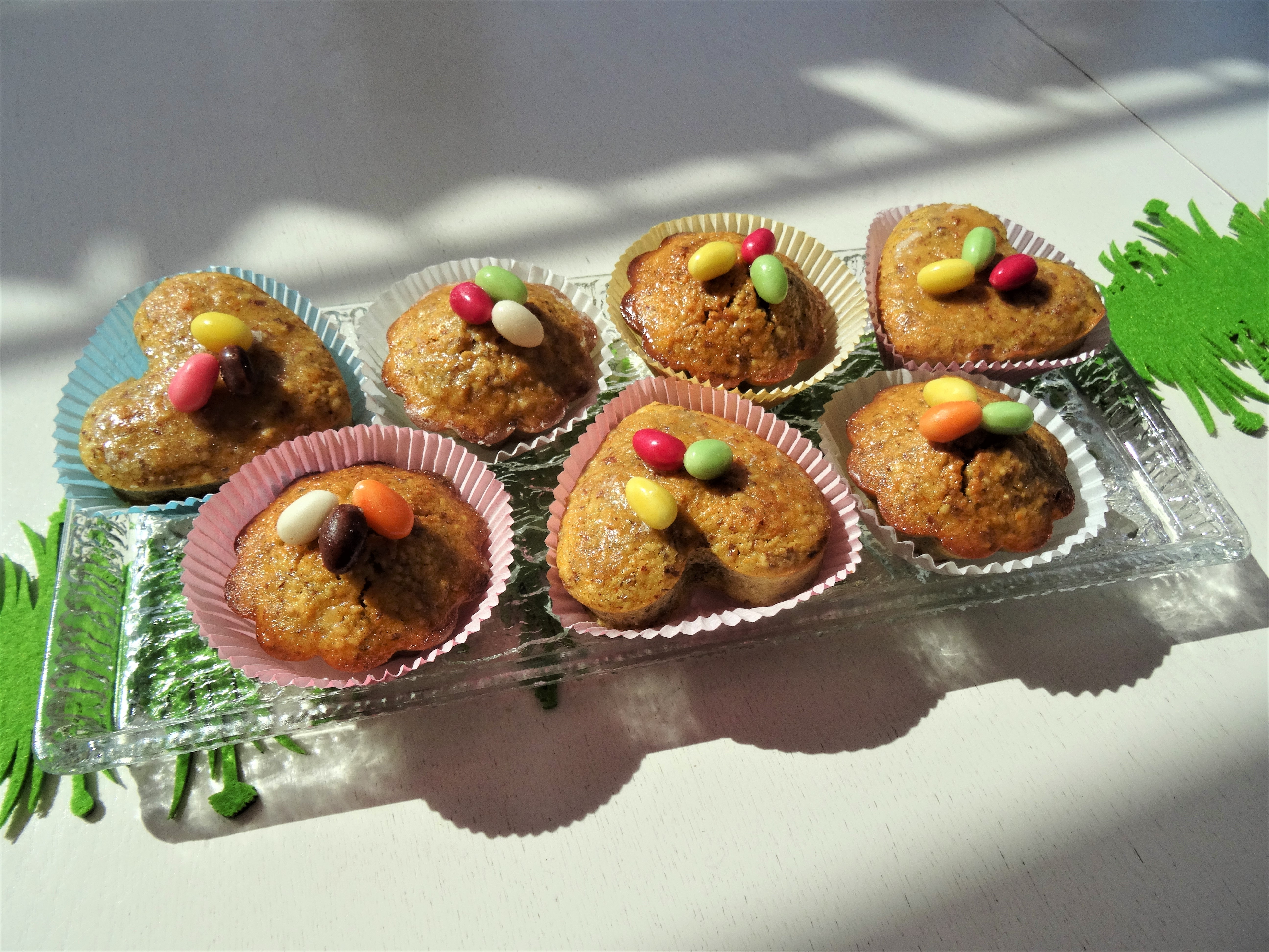 Da bald Ostern ist, dekorierte ich die fertigen Küchlein mit farbigen kleinen Ostereiern.