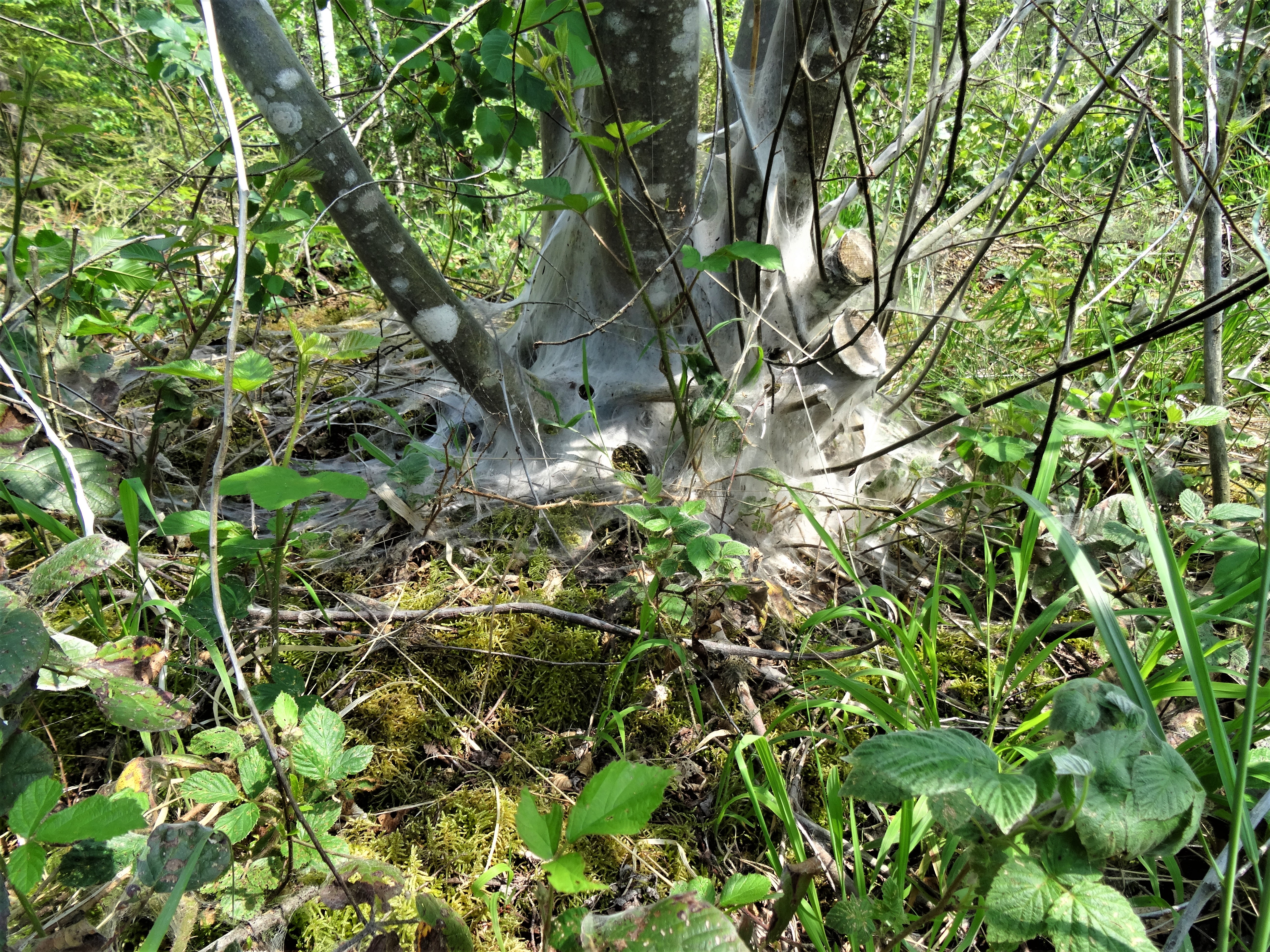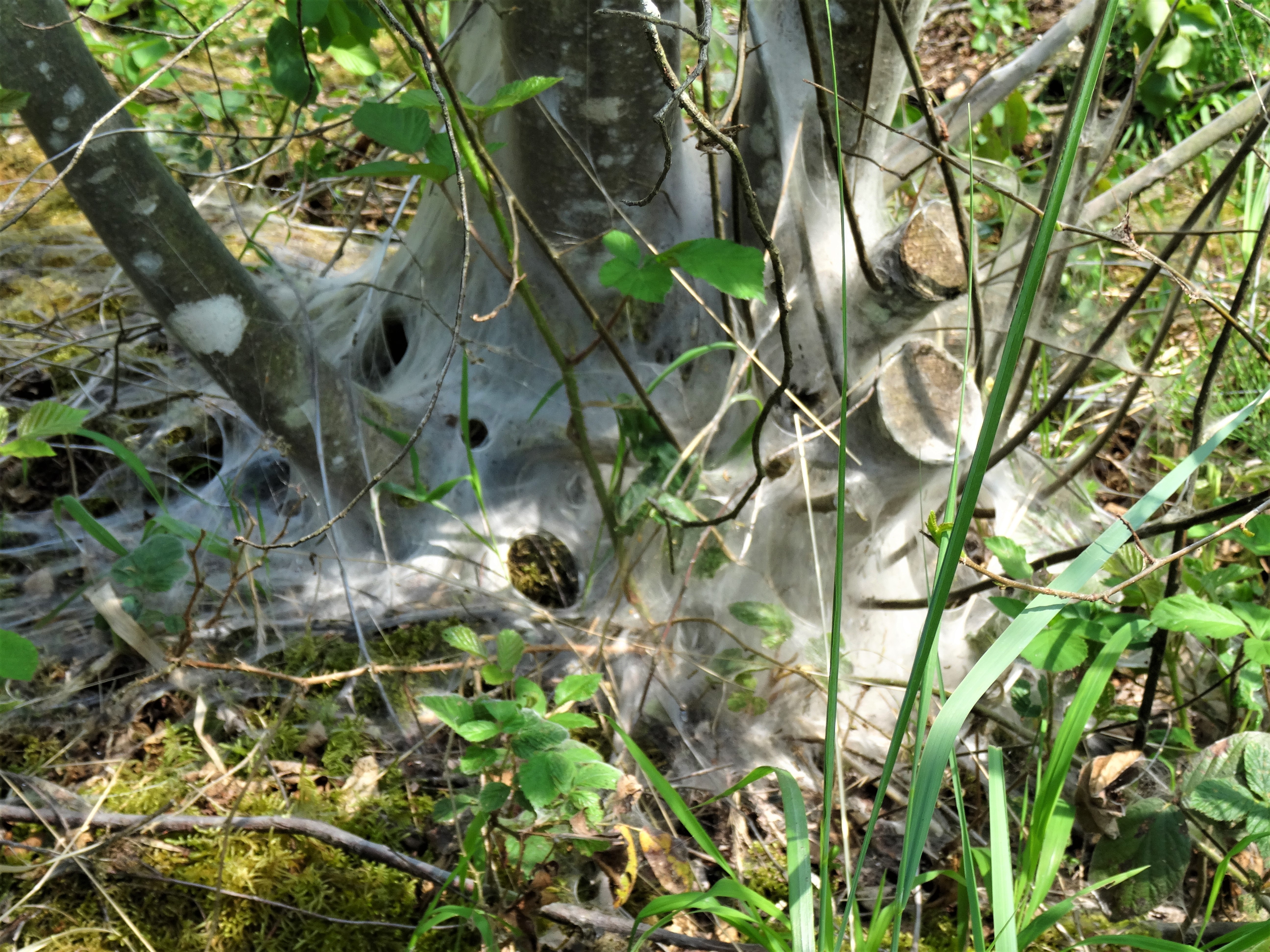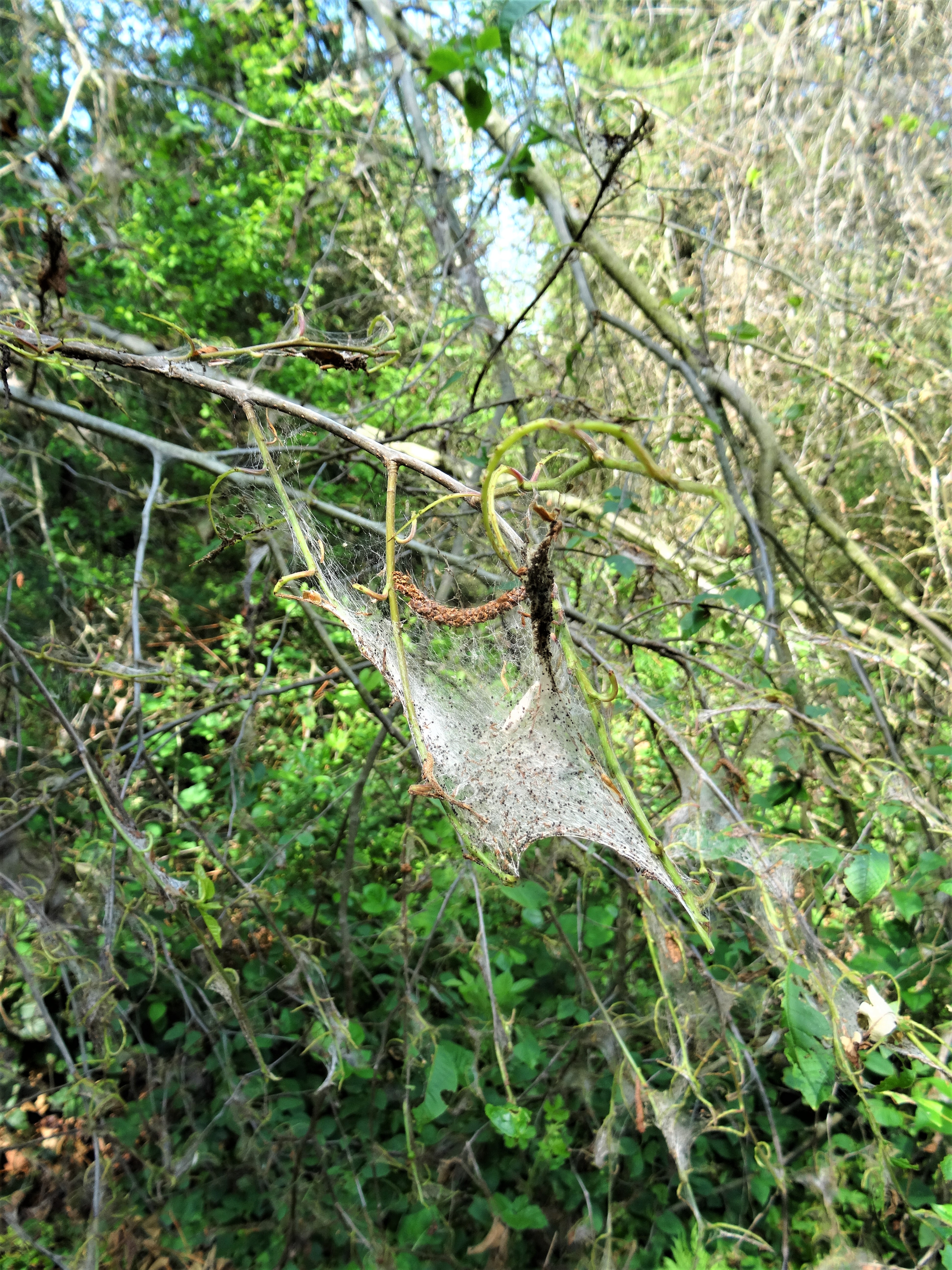 So etwas aussergewöhnliches sah ich noch nie. Auf einem Spaziergang im Naturschutzgebiet entdeckte ich wie sich auf Bäumen, in Büschen oder Sträucher ein schmutzig, graues Gewebe spannt, wo schon grüne Blätter waren. Schuld daran sind die Raupen der Gespinstmotte. Die Insekten lassen die Pflanzen kahlgefressenen unter einem netzartigen Schleier aus Seide zurück. Die Raupen produzieren die Eiweissfäden beim Fressen.