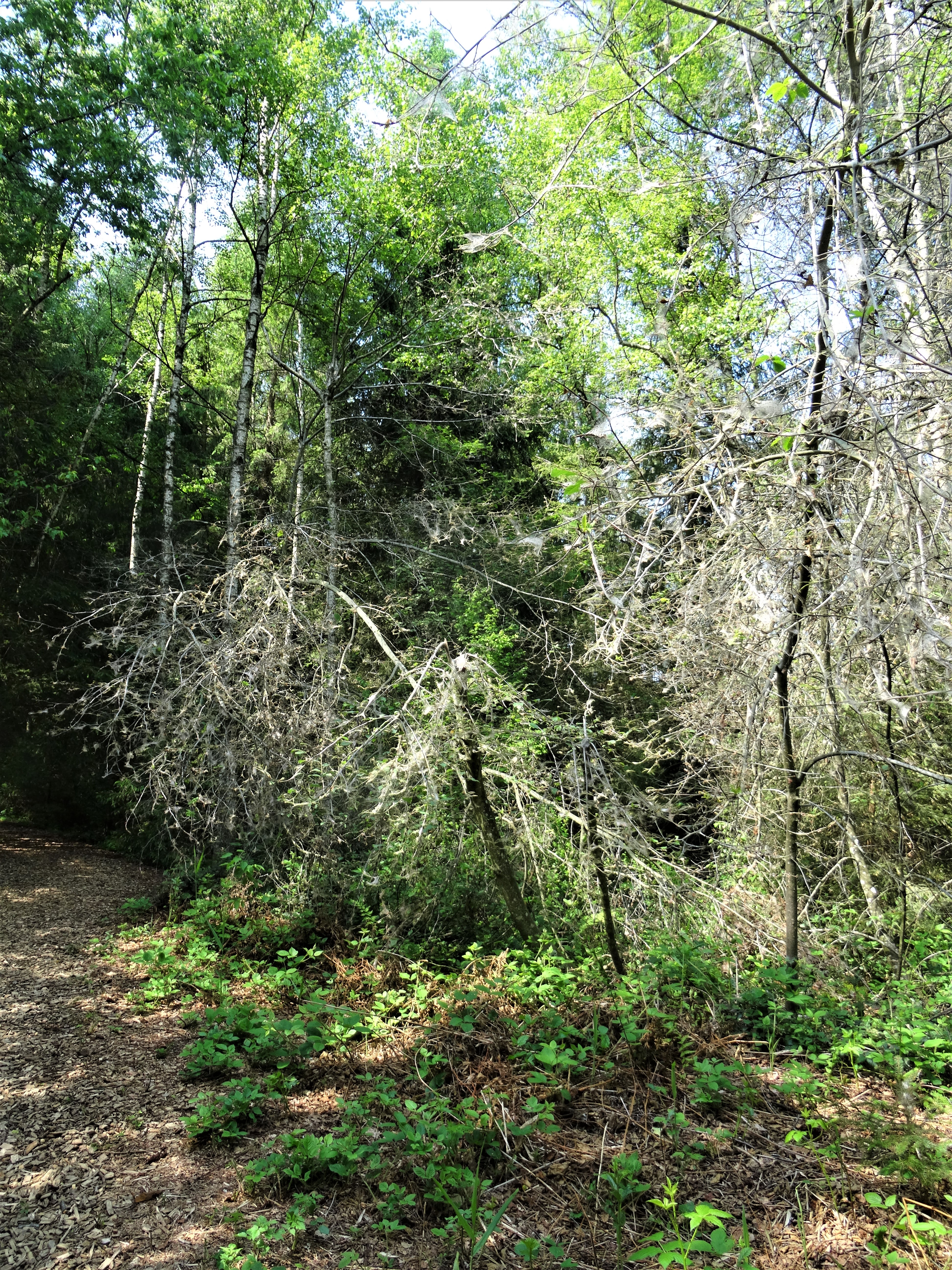 Zu Hause machte ich mich an die Recherche und fand diesen Artikel: Jedes Jahr werden Sträucher, Bäume und sogar ganze Baumgruppen kahlgefressen und mit silbrigen Fäden der Gespinnstmotten-Larven überzogen.