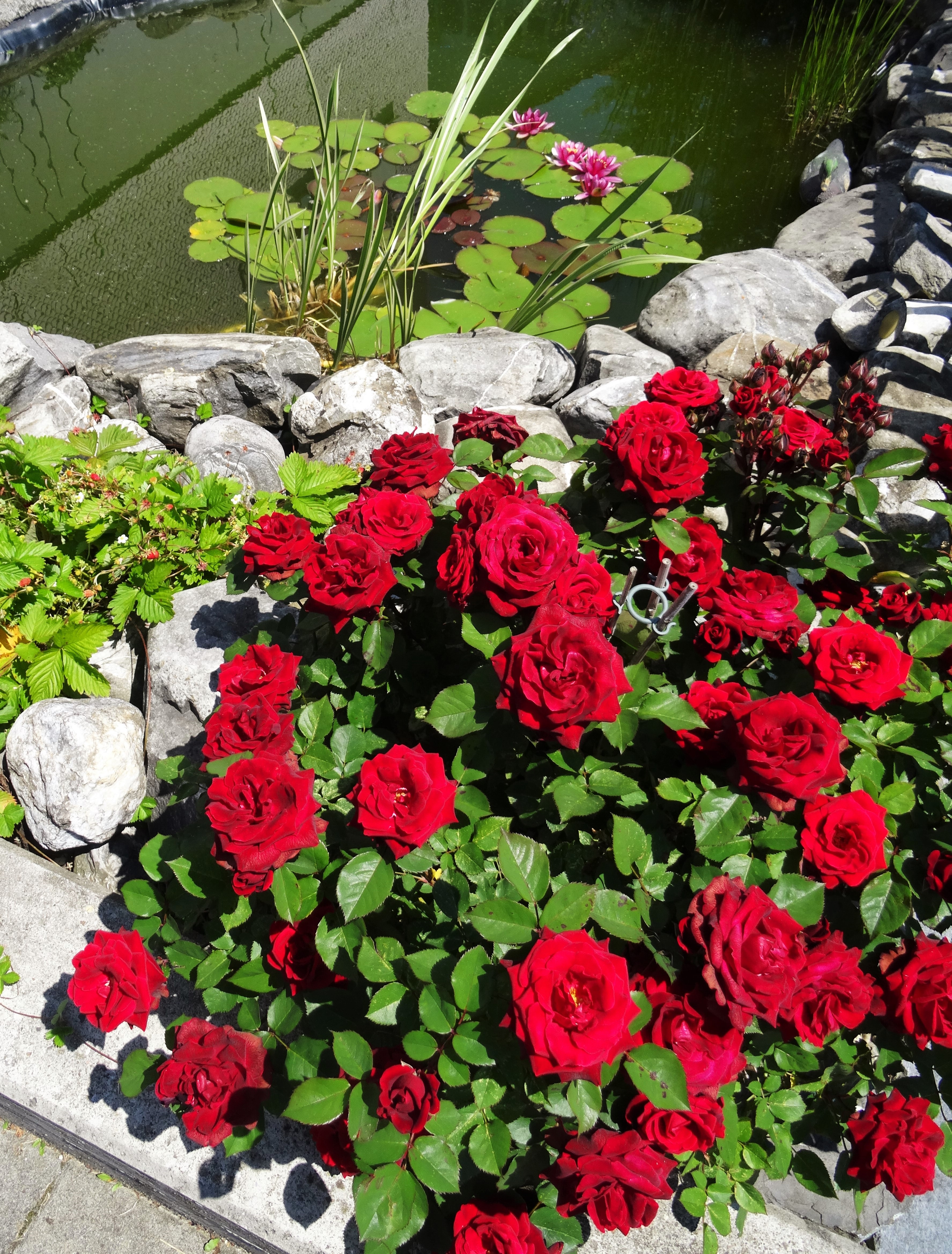 Wunderbar wie unsere rote Strauchrose blüht und im Sonnenlicht ihren Duft verströmt.