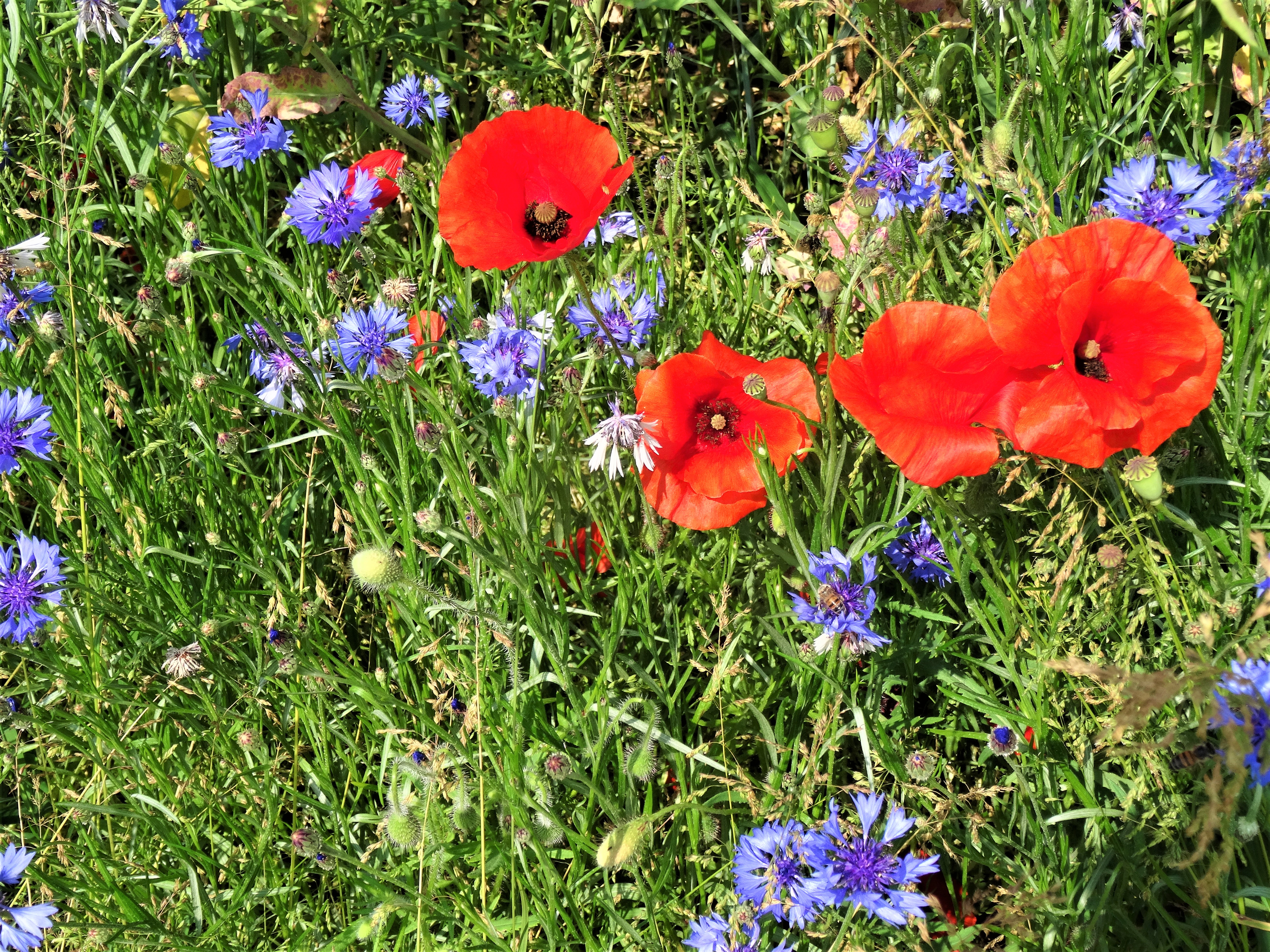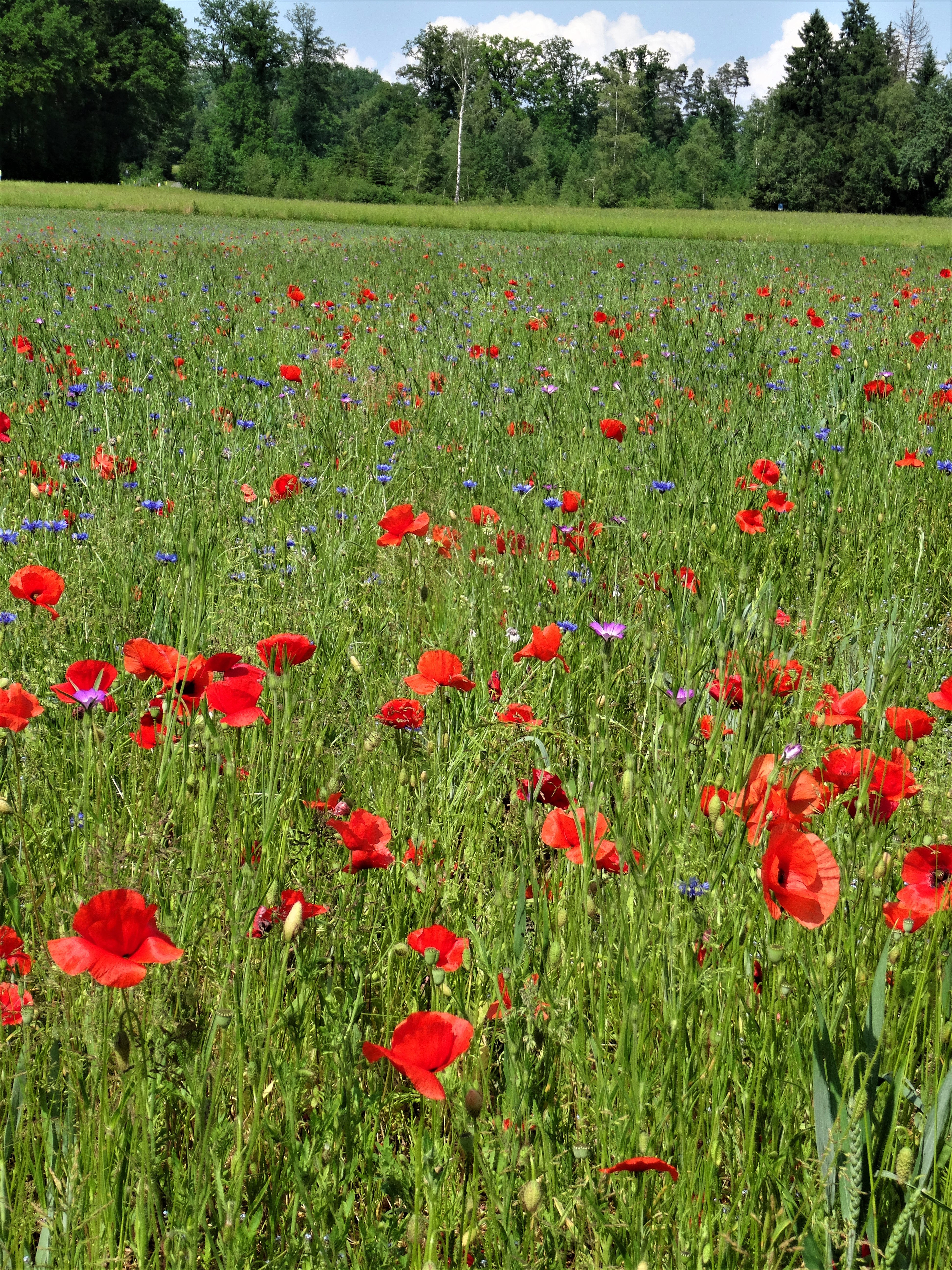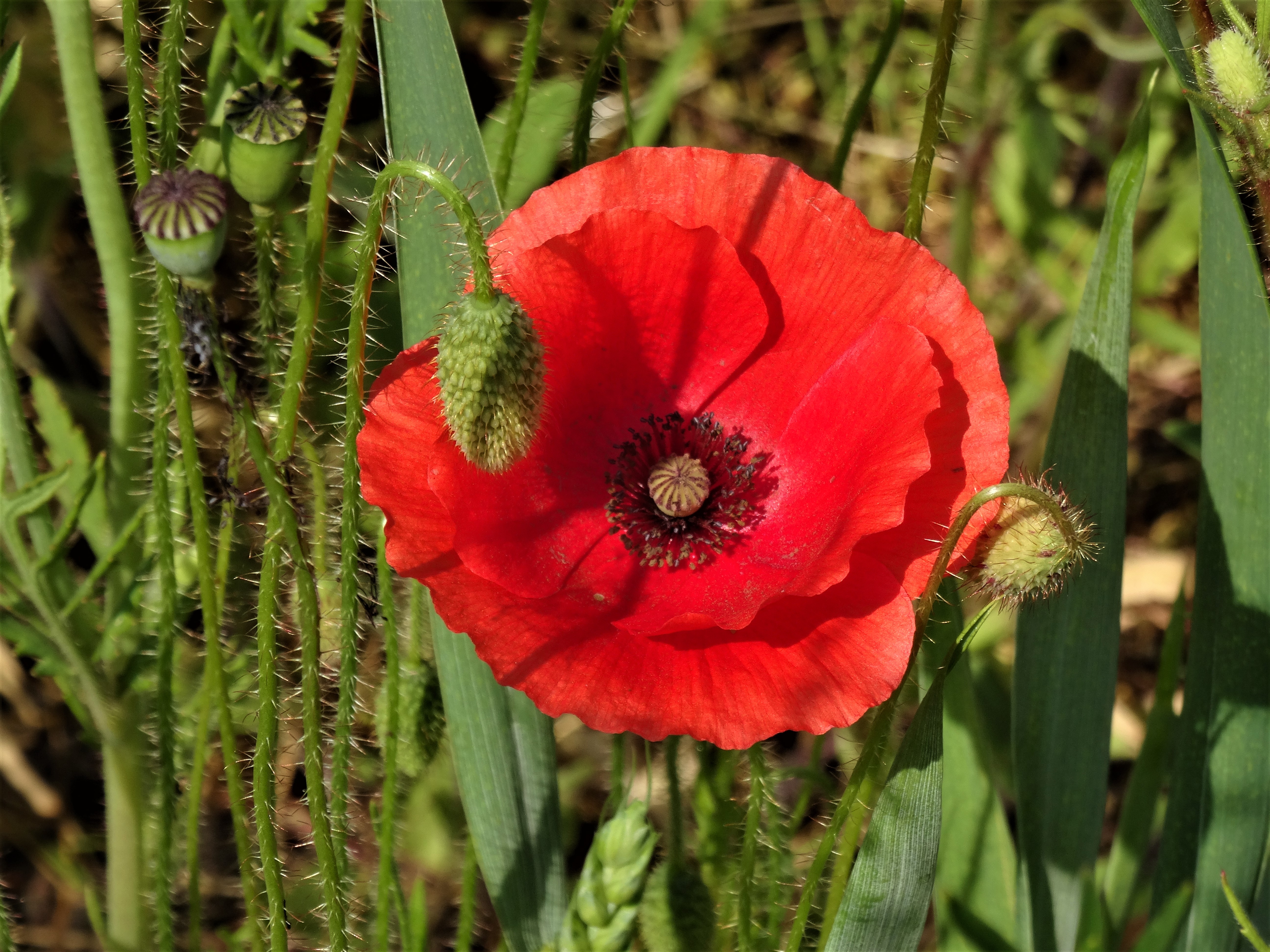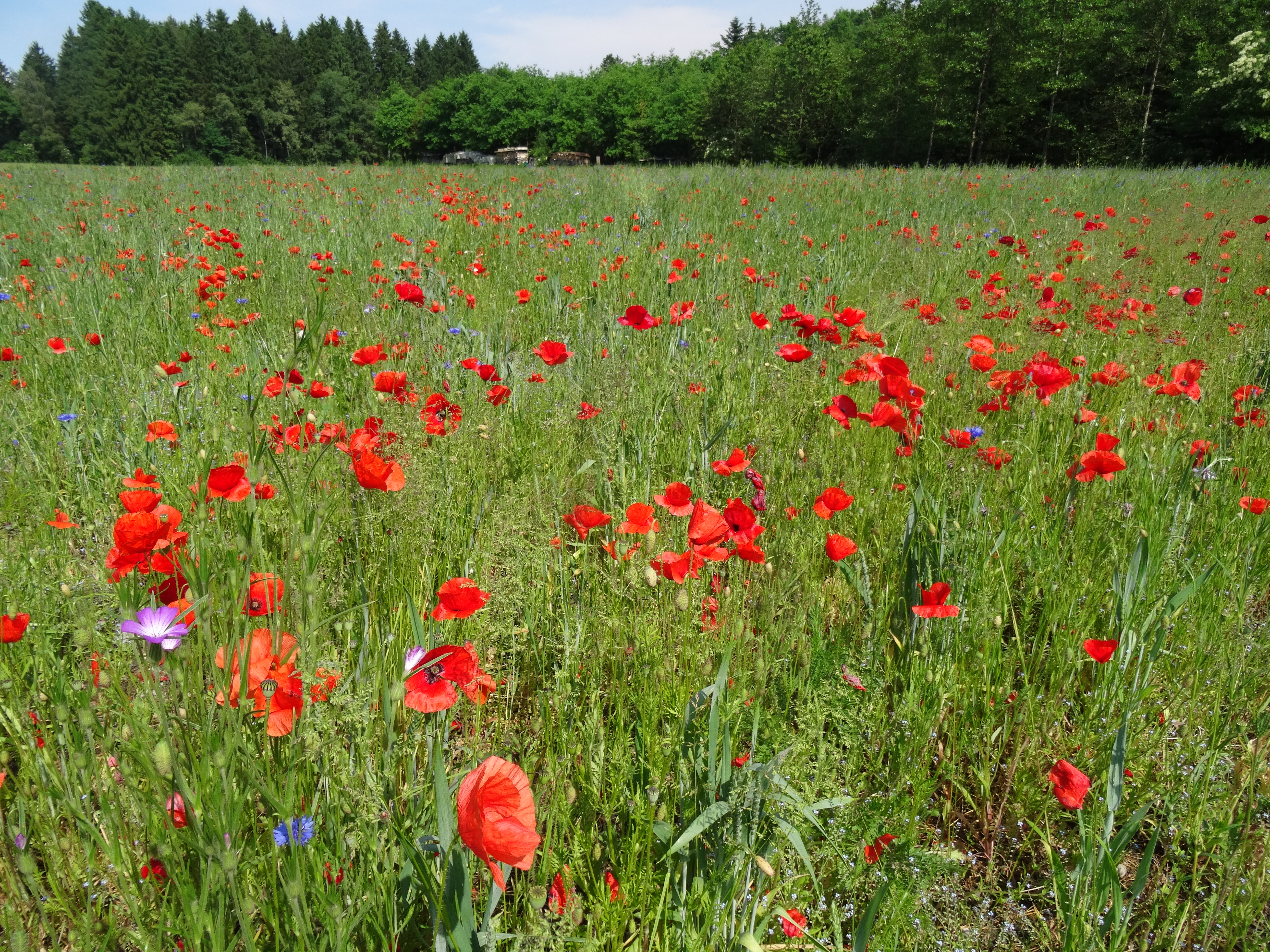 Als ich mit dem Fahrrad unterwegs war, leuchtete mir am Wegrand diese Mohnblume entgegen. Klar musste ich anhalten und diese Magerwiese näher betrachten. Das leuchtende Rot des Mohns sieht man immer seltener in der Natur.