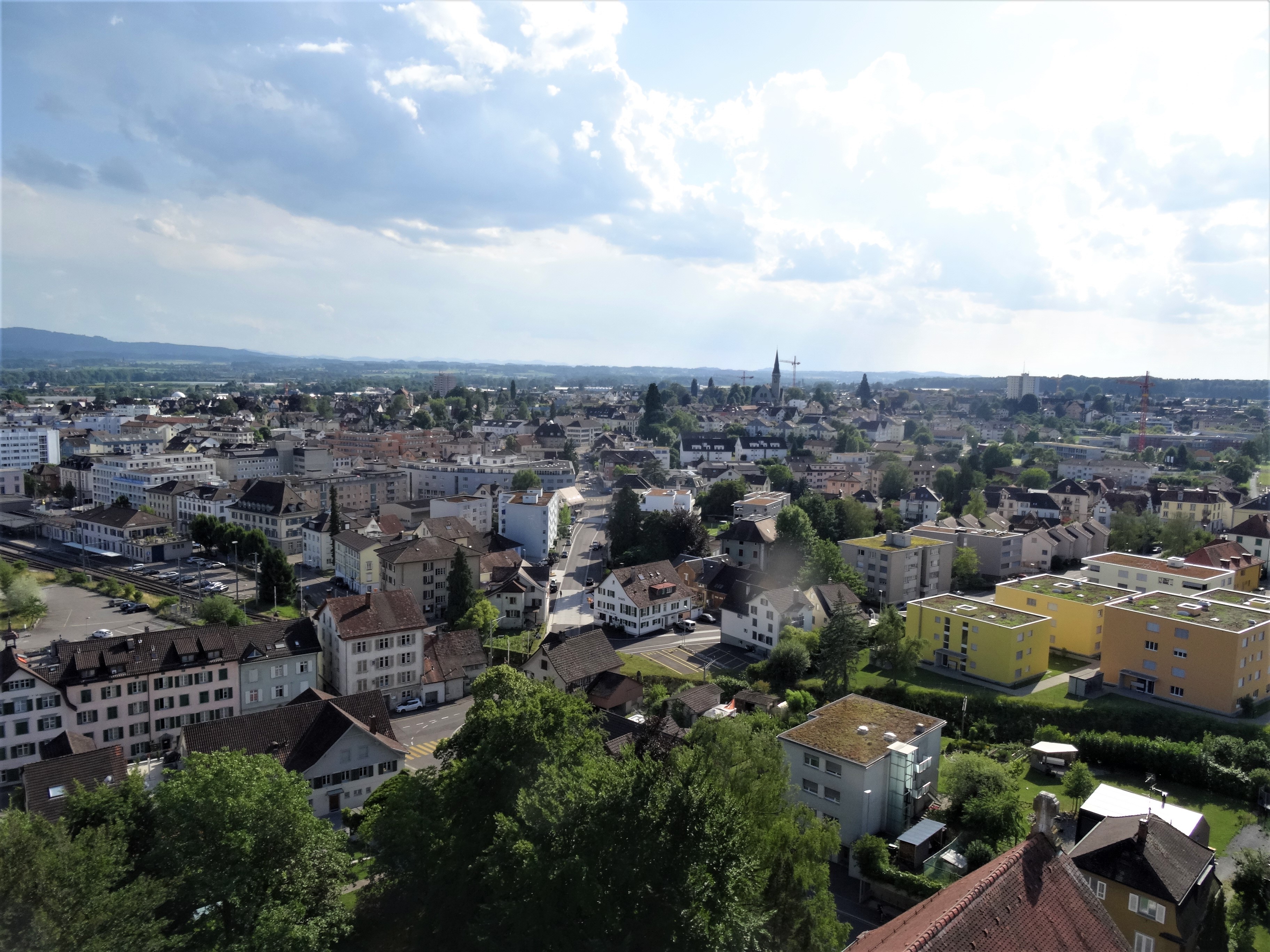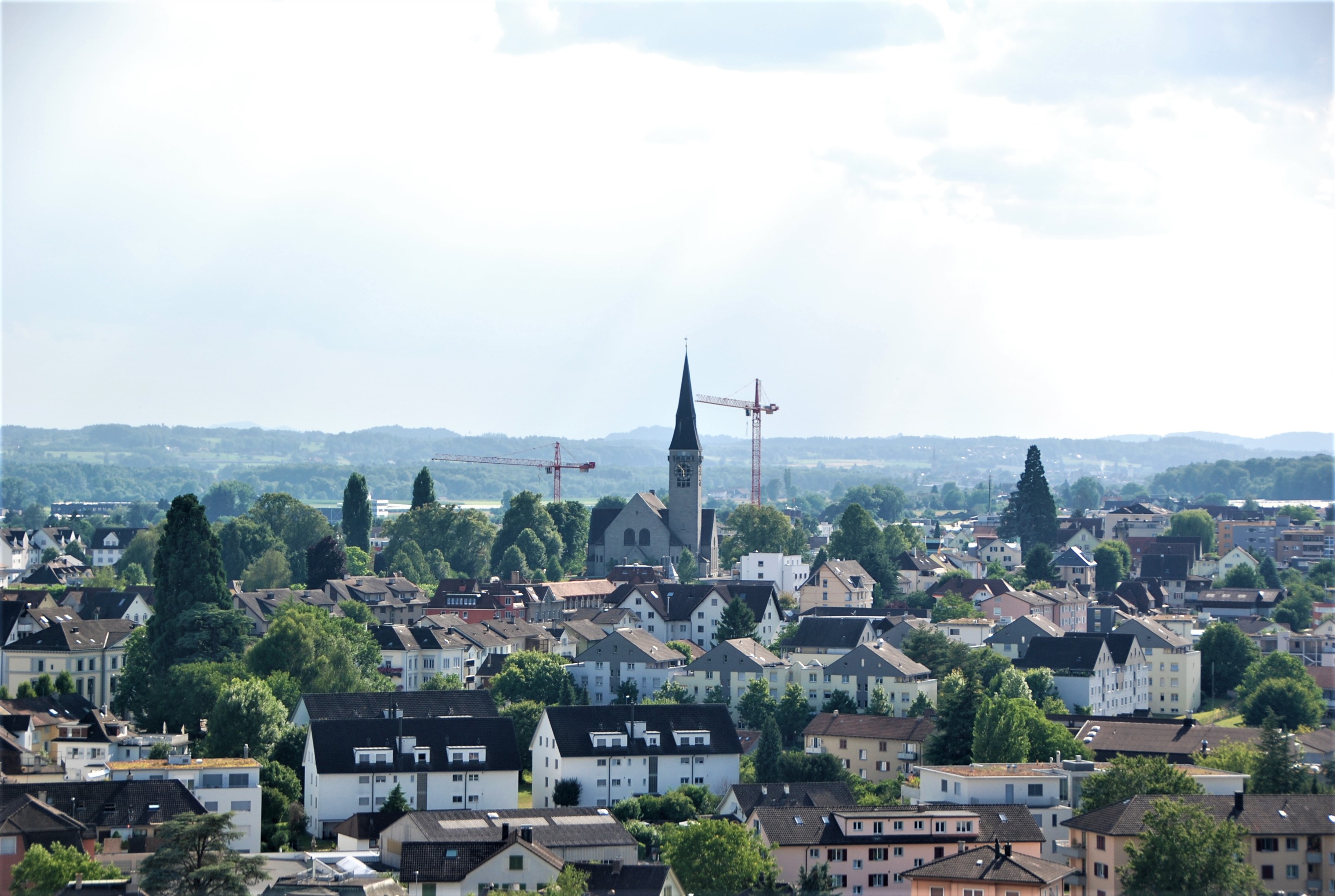 Den Blick hinauf zur Reformierten Kirche, wo momentan das letzte grüne Stück Land überbaut wird. Und weiter in der Ferne zu den Voralpen.