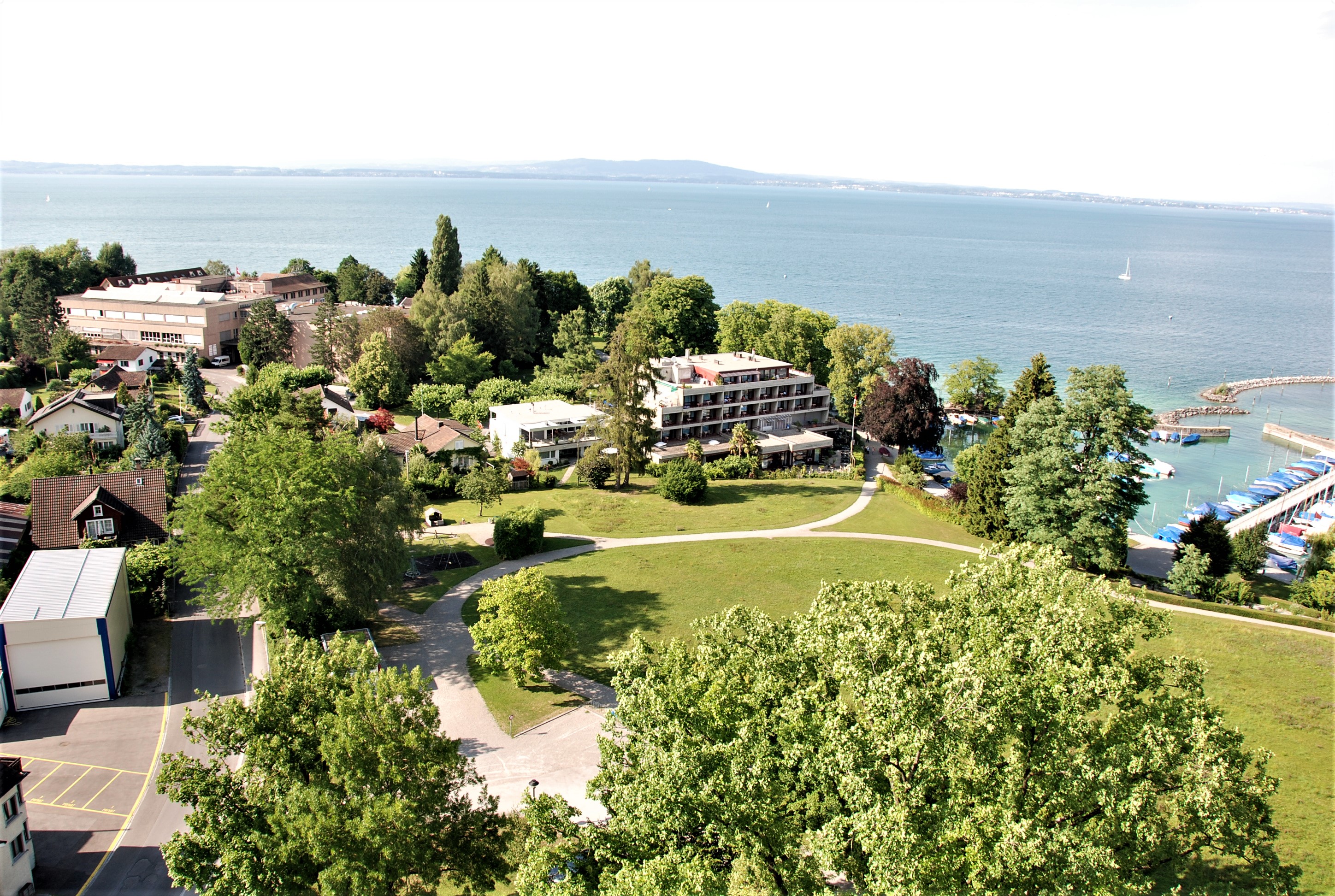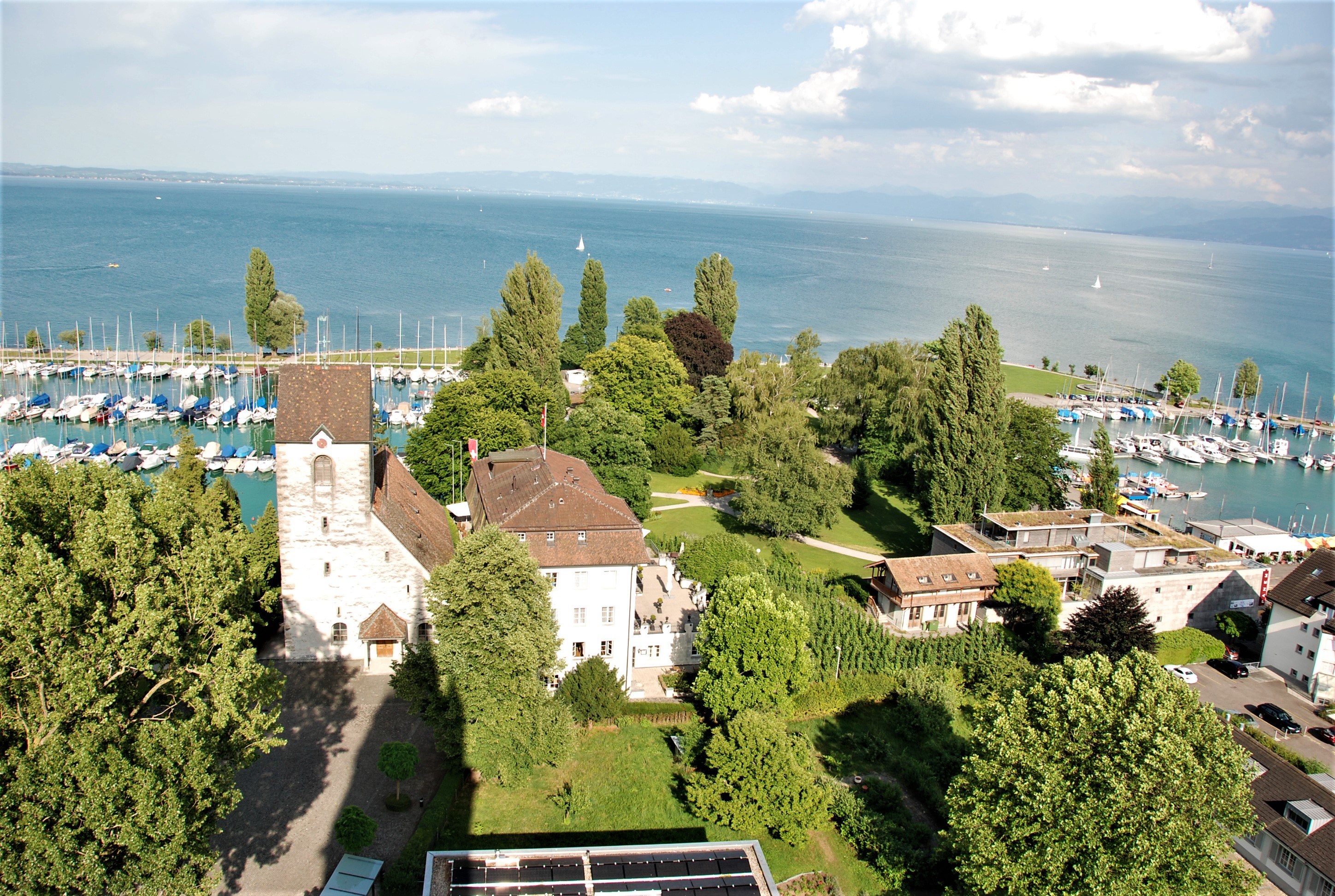 Rechts im Bild liegt der neue Segelhafen und links ist der alte Gemeindehafen. Dazwischen die Alte Kirche und das Hotel Schloss, die auf dem Denkmalgeschützten Hügel stehen.