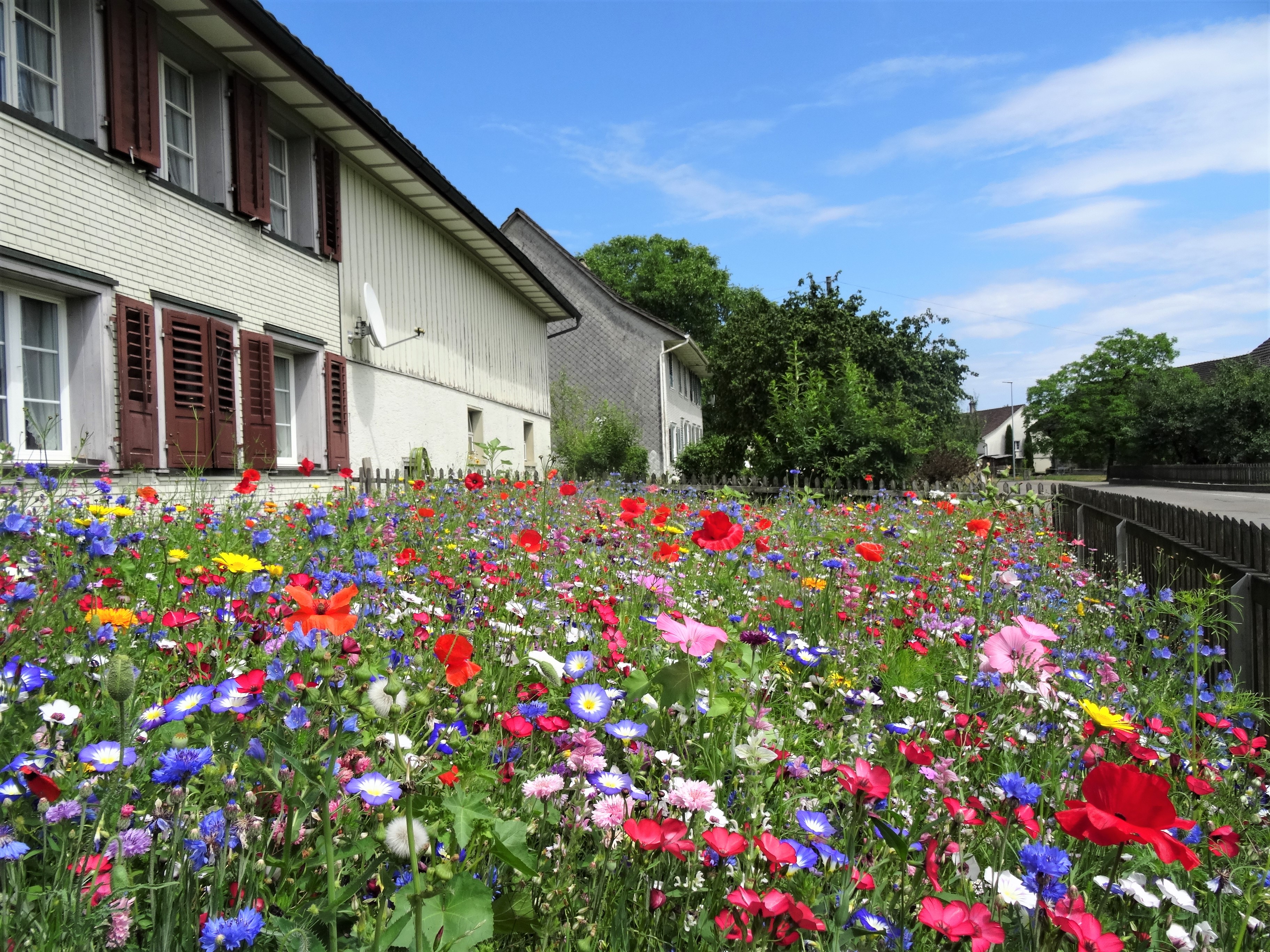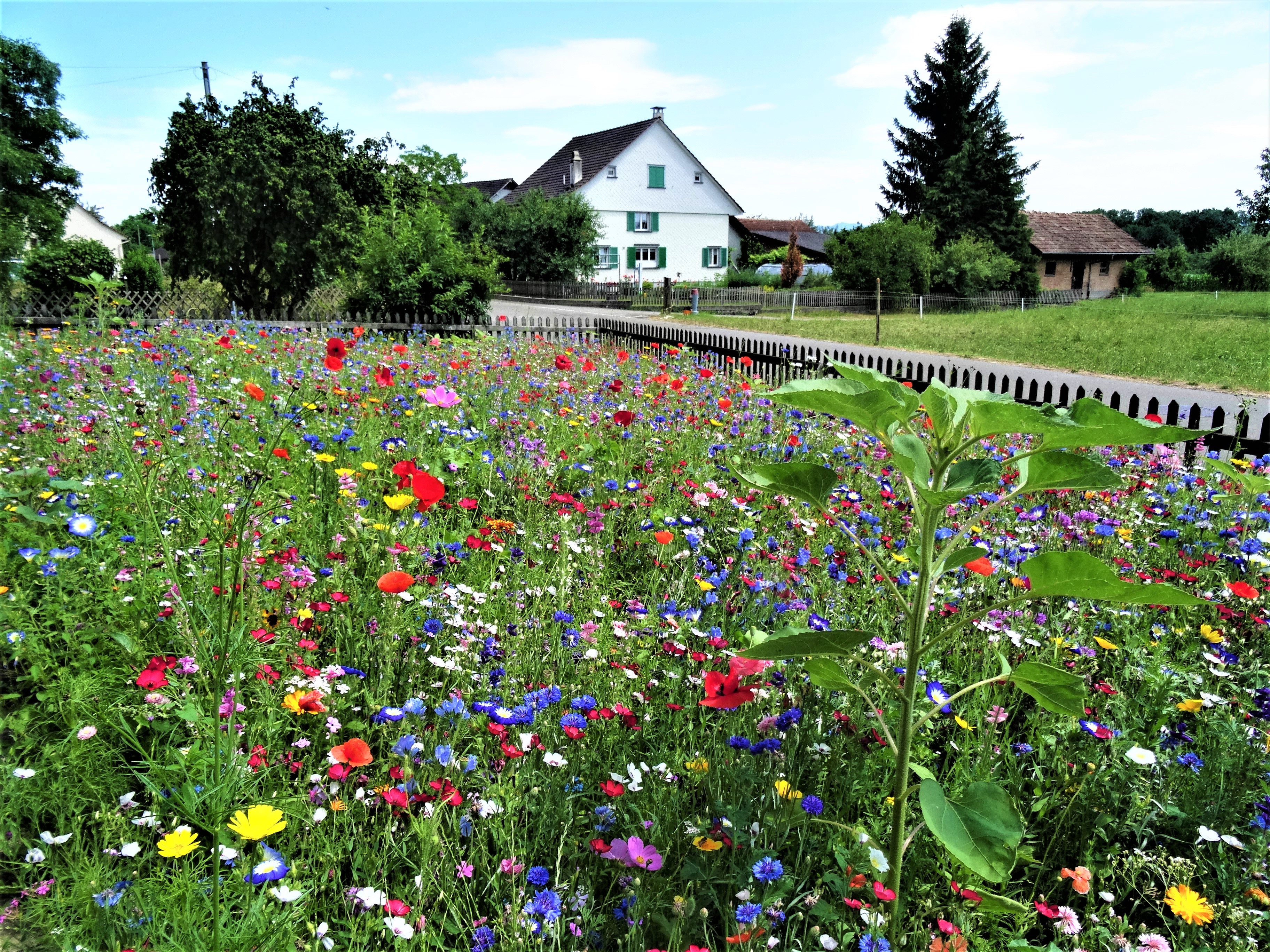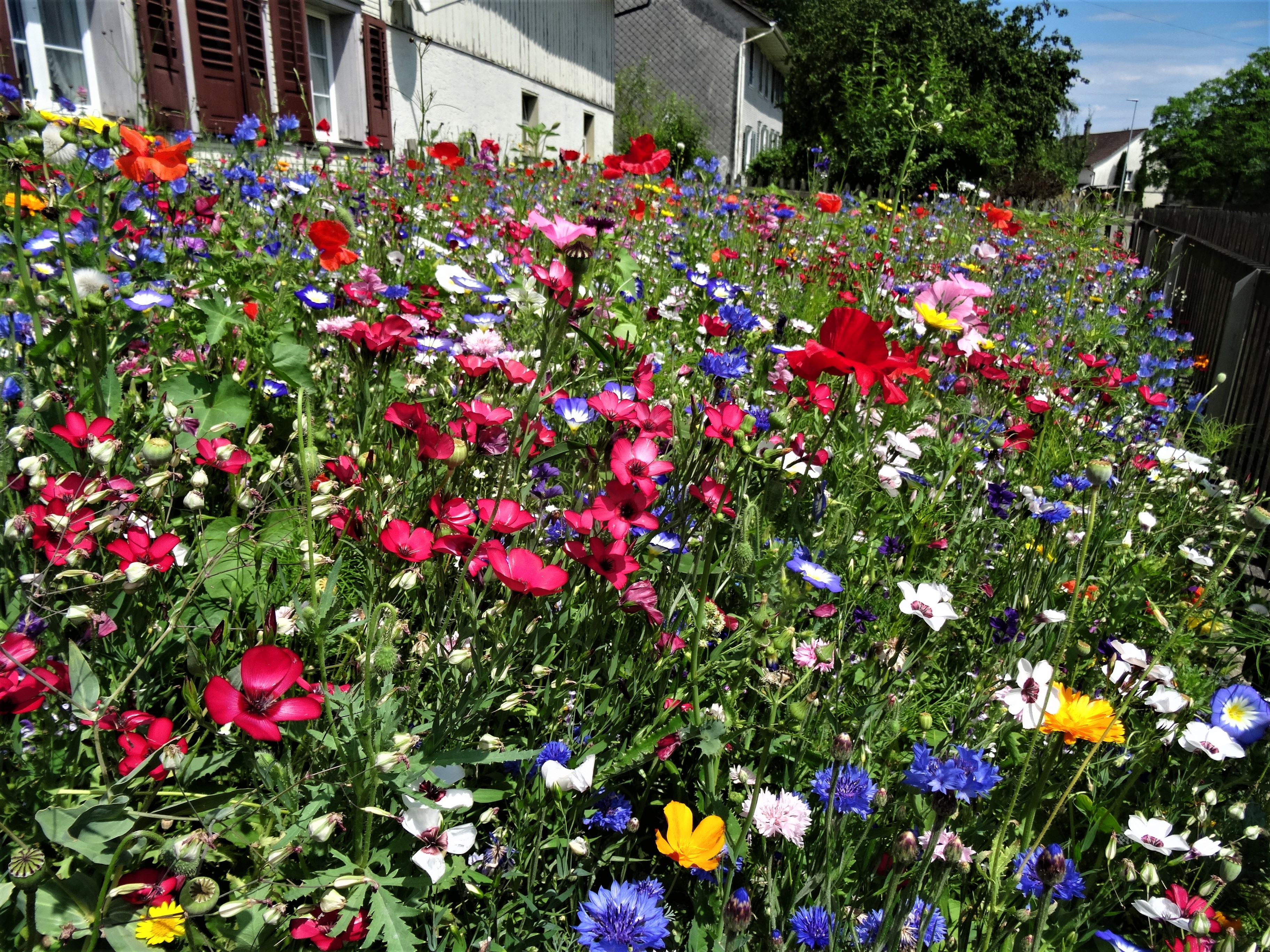 Aus der Not eine Tugend machen. Weil der Besitzerin die Arbeit im Garten zu viel wurde und das Stück Land nicht einfach brach liegen lassen wollte, säte sie diese Blumenmischung aus. Jetzt erfreuen sich ganz viele daran.