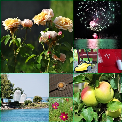 Die Rosen blühten im August üppig und besonders in den Abendstunden dufteten sie besonders intensiv. Vor dem Haus blühen ebenfalls die wildgewachsenen Cosmen der ganzen Hauswand entlang und lassen die Tomaten dahinter rot werden. Aber auch die Äpfel bekommen rote Bäckchen und die Physalis sind schon erntereif. Das schöne, meist heisse Sommerwetter im August genoss ich viel am See. Beim Eindunkeln fand fast jedes Wochenende rund um den See ein Feuerwerk statt, das immer weit herum sichtbar war. Mein Fahrradunfall lief glücklicherweise glimpflich ab. Ausser ein paar blauen Flecken und eine Reparatur am Velo ist nichts passiert. Da merkte ich, wie rasch es geht mit den schnellen E-Biks. Ich war aber auch fleissig diesen Monat. Ein paar hundert Vorhangringe nähte ich fast meditativ vor dem Fernseher an und der Wintergarten glänzt wieder nach einer gemeinsamen Putzaktion.