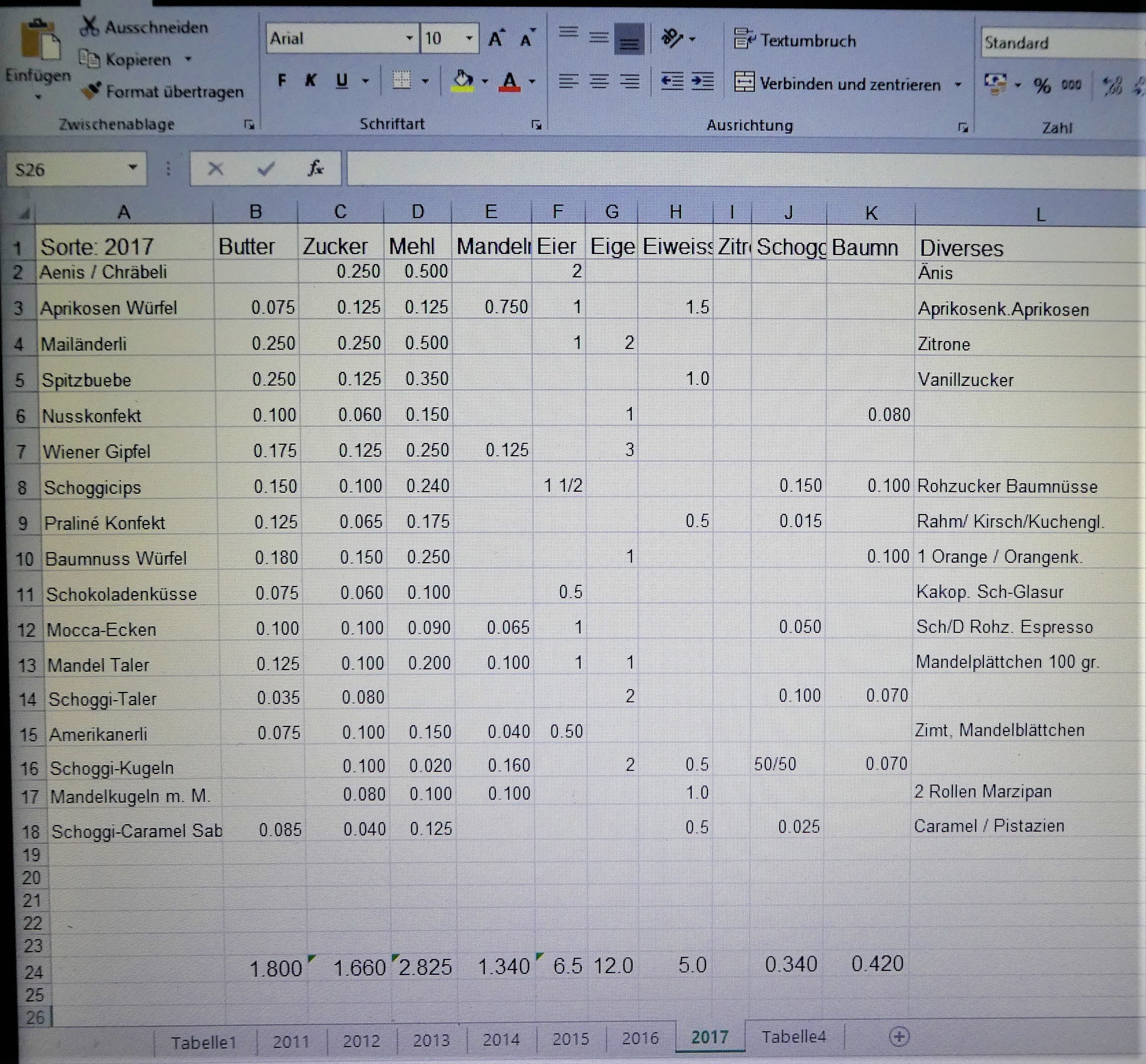 Da wir getrennt „guetzleten“ sind es dieses Jahr weniger Sorten. Letztes Jahr haben wir 21 Sorten gemacht, und dafür unter anderem 2 kg Butter, 3 kg Mehl und 12 Eier gebraucht. Aber wie heisst es doch so schön: weniger ist manchmal mehr.