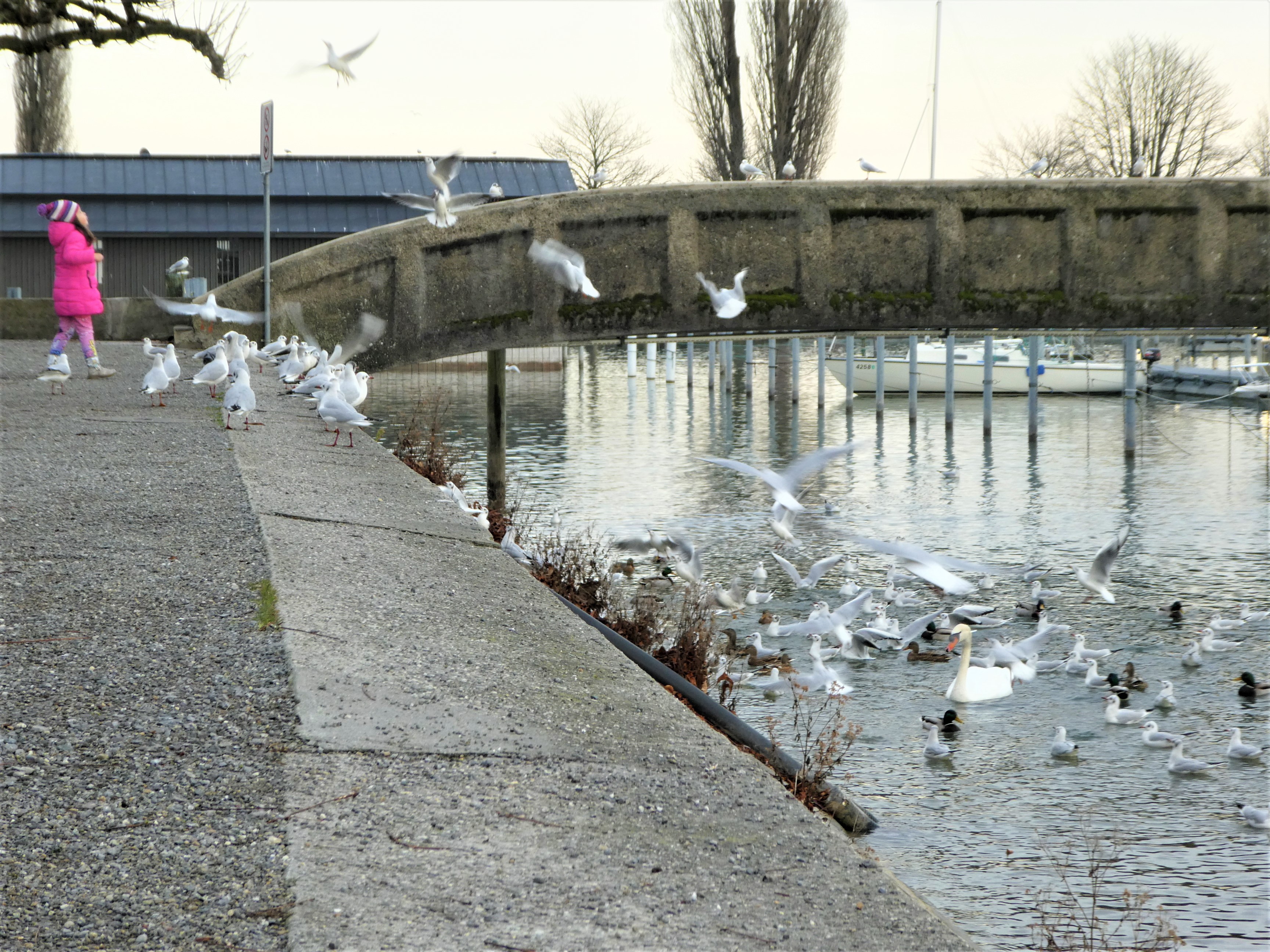 Natürlich fliegt der ganze Schwarm nicht einfach so herum, sondern möchte gerne einen Bissen erwischen von dem Brot, welches das Mädchen freudig in die Luft wirft.