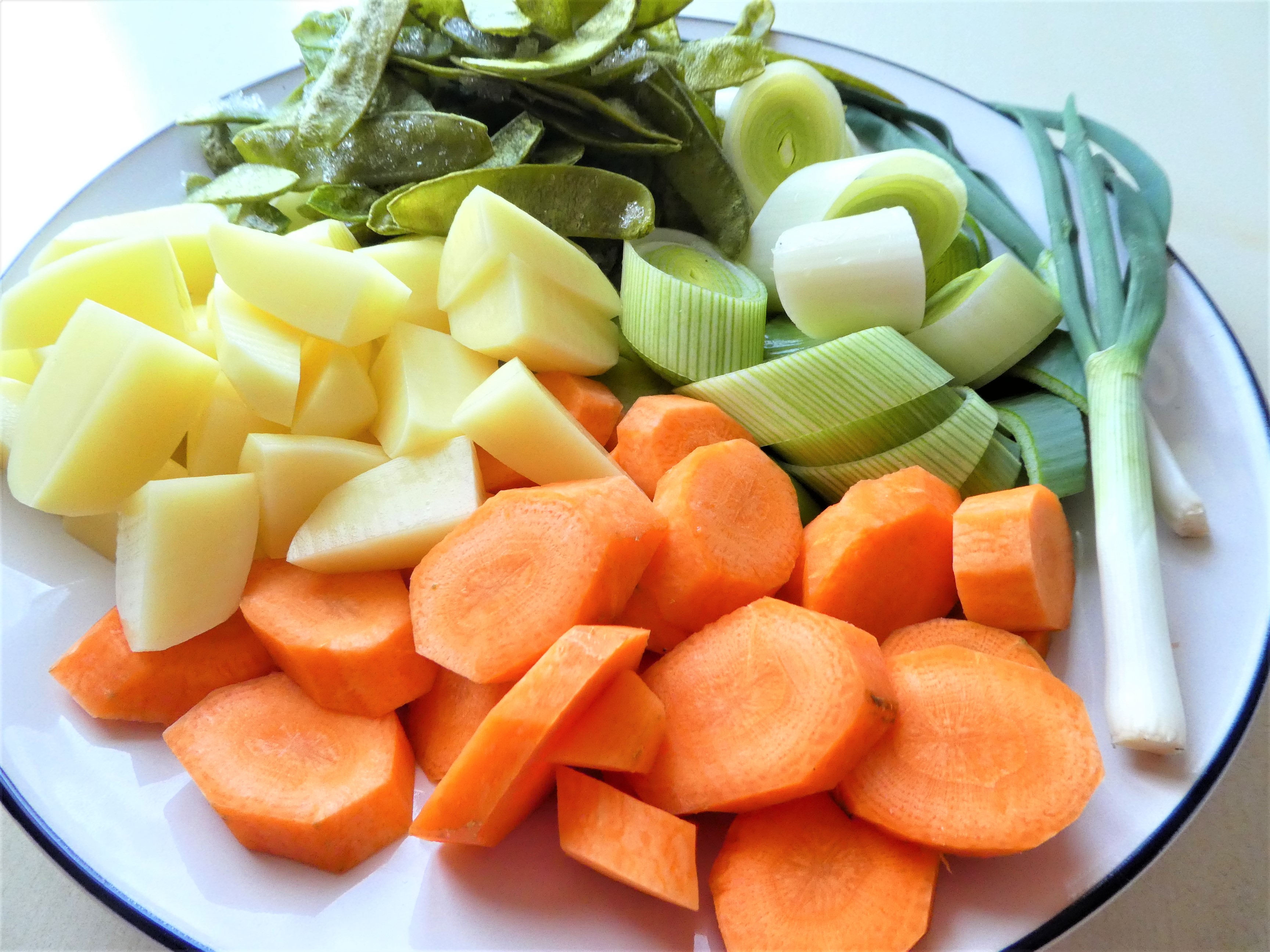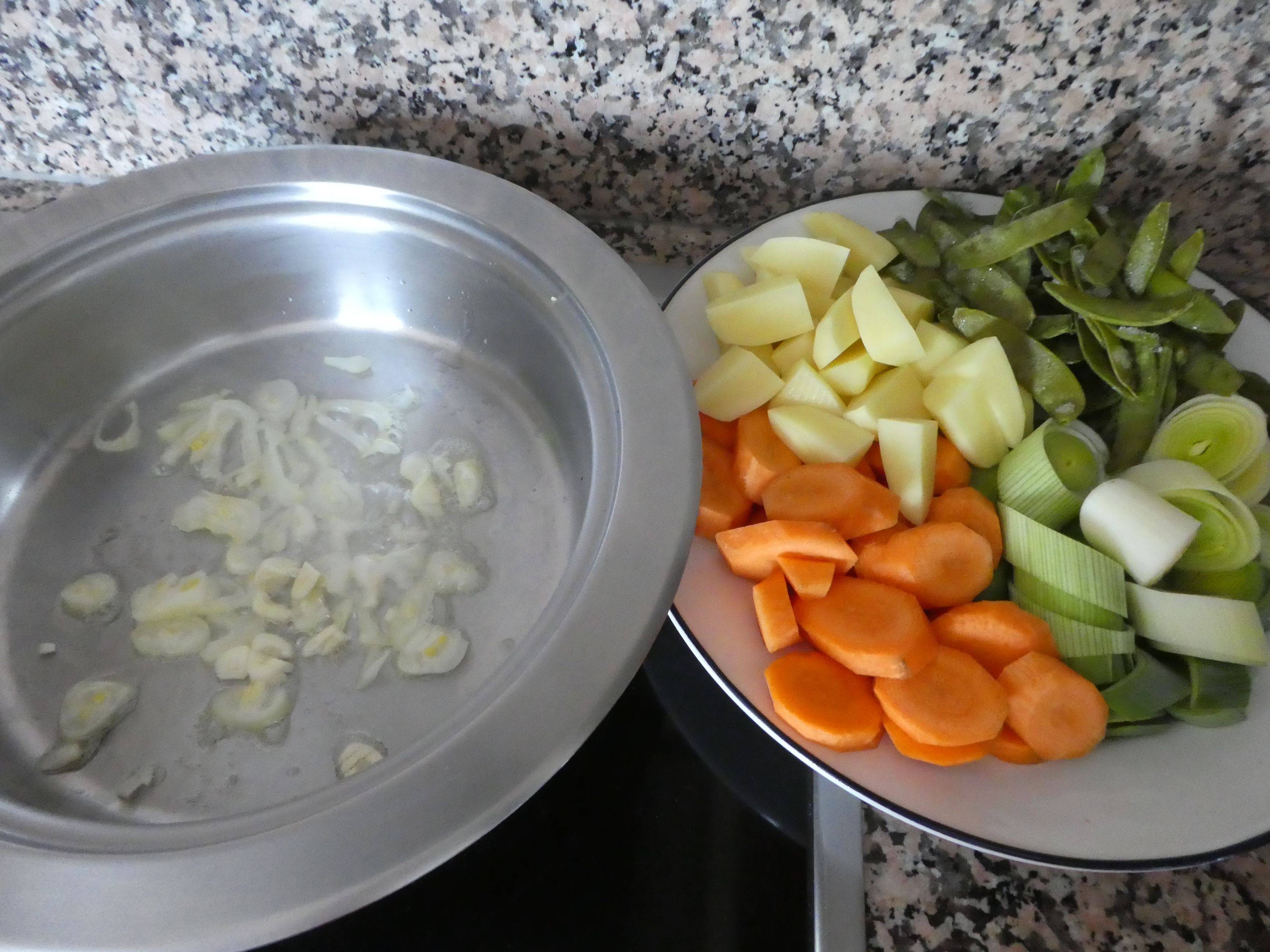 Aber der Kochvorgang bleibt immer gleich. Es werden Zwiebeln in Ringe geschnitten und zusammen mit Knoblauch in Butter angedünstet. Kartoffeln und Karotten sind eigentlich immer dabei. Heute kommt noch Lauch und Kefen dazu.