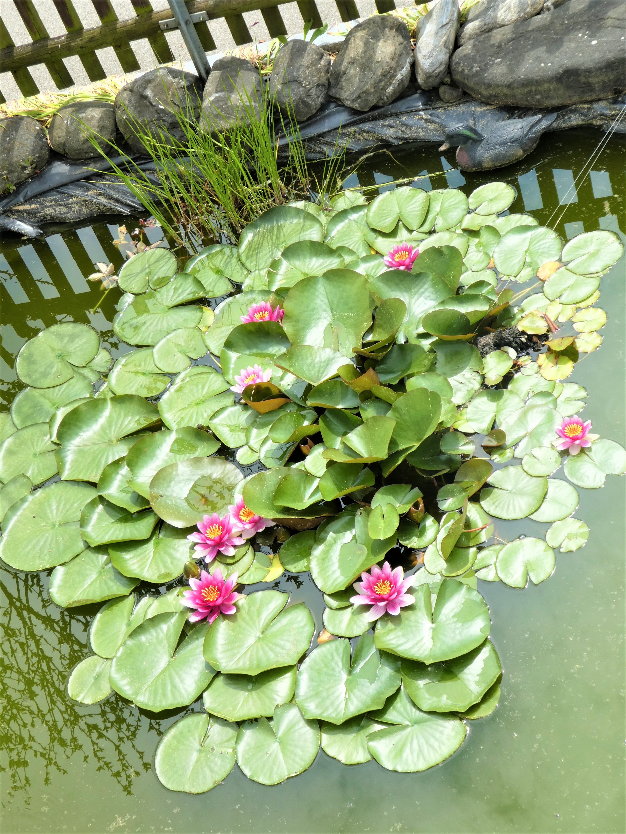 Auch die Seerosen sind dieses Jahr äusserst blühwillig und die grossen Blätter türmen sich in der Mitte auf.