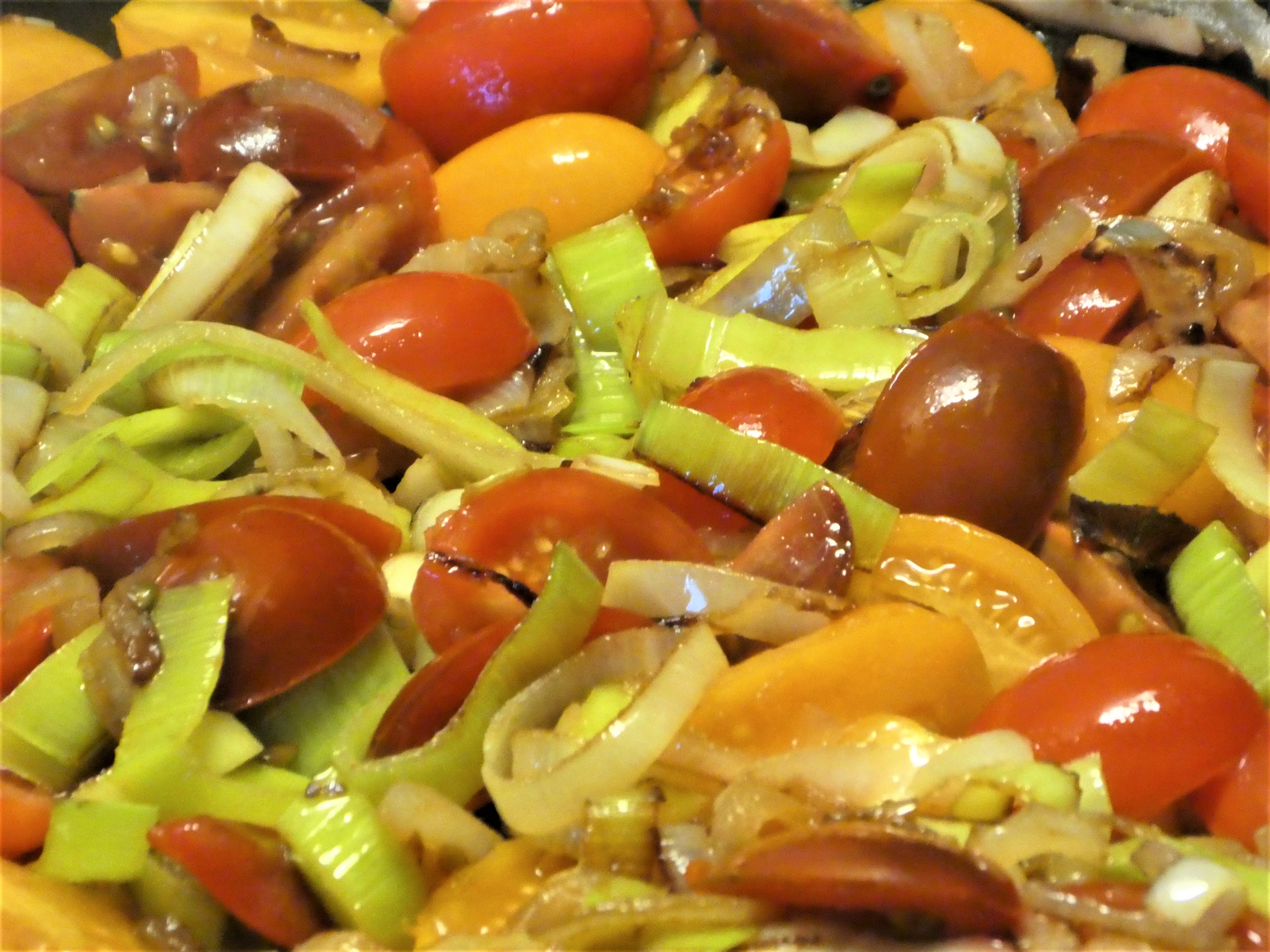Ich schnitt eine Zwiebel und einen Lauch in feine Streifen und dünstet sie in Olivenöl an. Die Sauce habe ich mit kleinen farbigen Tomaten und mit einem Glas Sonne aus meinem Vorrat zubereitet.Schade gibt es kein Duft-Internet, weil zusammen mit frischem Thymian und Oregano verteilte sich ein verführerischer Duft.