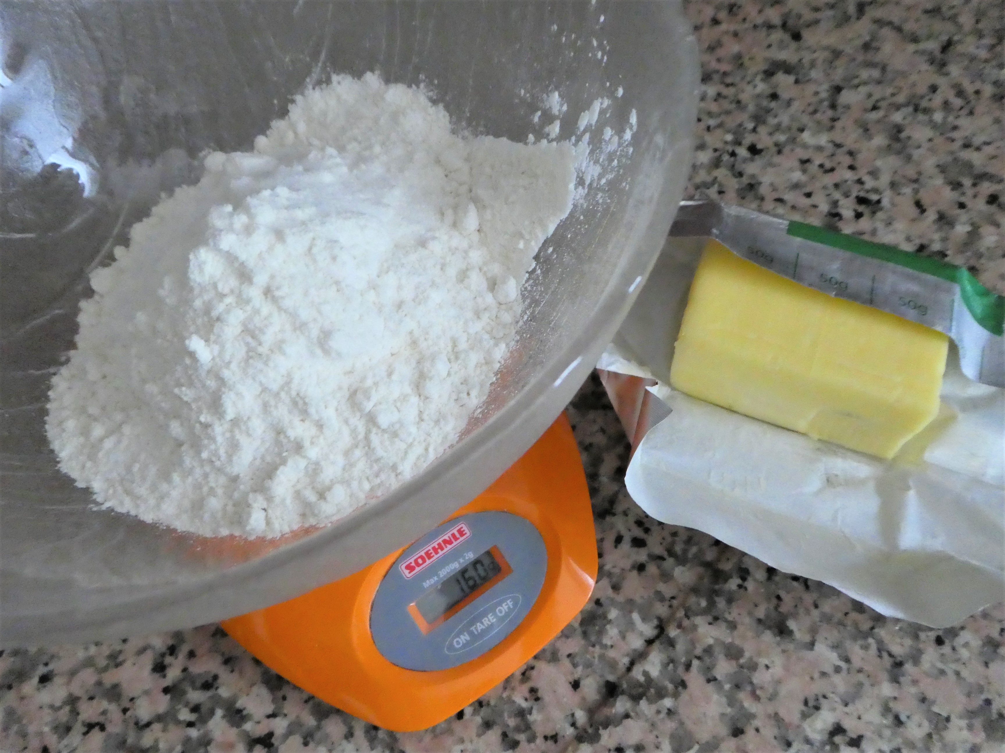 Mein Teig für einen knusprigen Kuchen ist schnell selber gemacht. 150 gr Mehl, 75 gr Butter, etwas Salz und 3-4 EL Wasser zu einem Teig zusammenfügen und kurz kühl stellen.