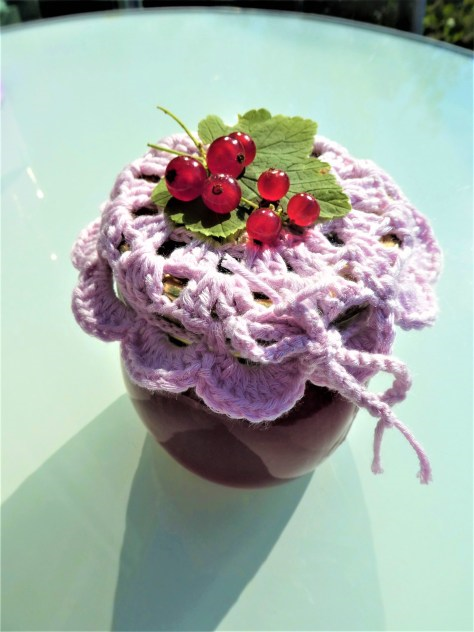Ich legte die Beutel zwischen zwei gehäkelte Grannys und verschloss sie mit einem passenden Bändel. Das sind dankbare Mitbringsel, die ich gerne verschenke.