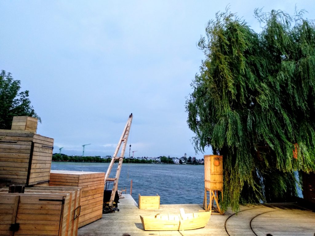 Insgesamt modellierten und verbauten neun Zweierteams 300 Tonnen Bodenseesand. Das Ausstellungsgelände liegt direkt am Seeufer. Die Figuren und die vielen Besucher geniessen die schöne Aussicht.
