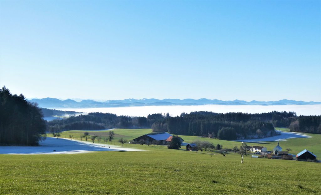 Die Nebelschwaden kamen an diesem Tag immer näher, aber die Januarsonne war stärker. Weit unten in der grauen Suppe liegt unser Zuhause.
