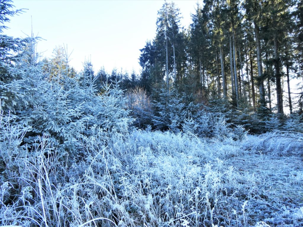Wenn man auf die Schattenseite kommt, liegt der Raureif bis weit in die Wiese hinein und man merkt, dass es recht kalt ist hier oben in der Nacht. So wie Winter sein muss und wir ihn auch gerne hätten.