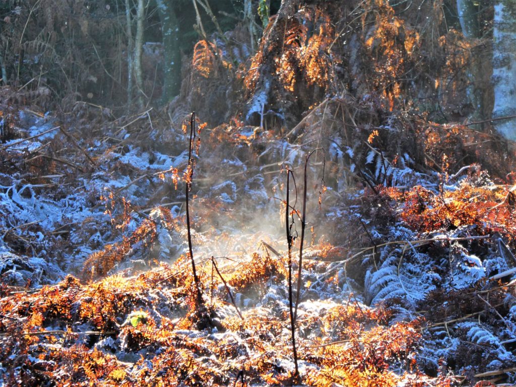 Im Schatten hält sich der Reif länger, aber oh weh, die Sonne bringt es fertig die frostige Schönheit verdampfen zu lassen. Sehr schön sind auch die Blicke hinunter ins Tal, in Richtung Nebelsuppe.
