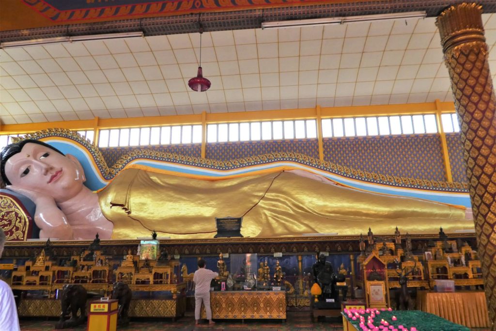 Um die liegende Statue sind weitere, sitzende Buddhas angeordnet. Ihre unterschiedlichen Gesten stellen die 12 Tierkreiszeichen dar. Die ganz Reihe auf ein Bild zu bannen war bei den vielen Besuchern nicht möglich. Ich habe die vier Buddhas mit den Sternzeichen meiner Familie fotografiert.