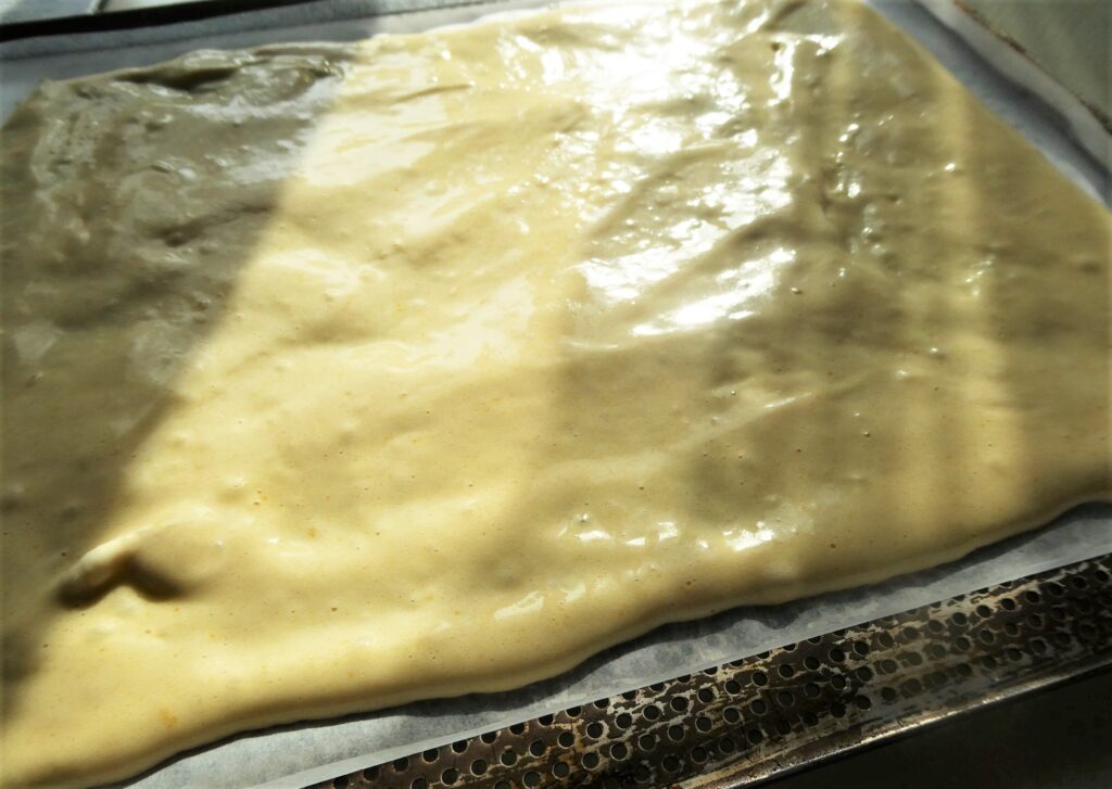 Dann 7 -9 Minuten bei 200 Grad backen. Jetzt kommt der Trick, damit die Roulade gelingt: Nach dem Backen den Biskuit sofort auf ein zweites Backpapier stürzen und mit einem nassen Tuch das Backpapier abwischen. So lässt sich das Backpapier gut vom Teig lösen. Das Backpapier wieder auf den Teig legen, mit dem umgedrehten Backblech zudecken und auskühlen lassen.
