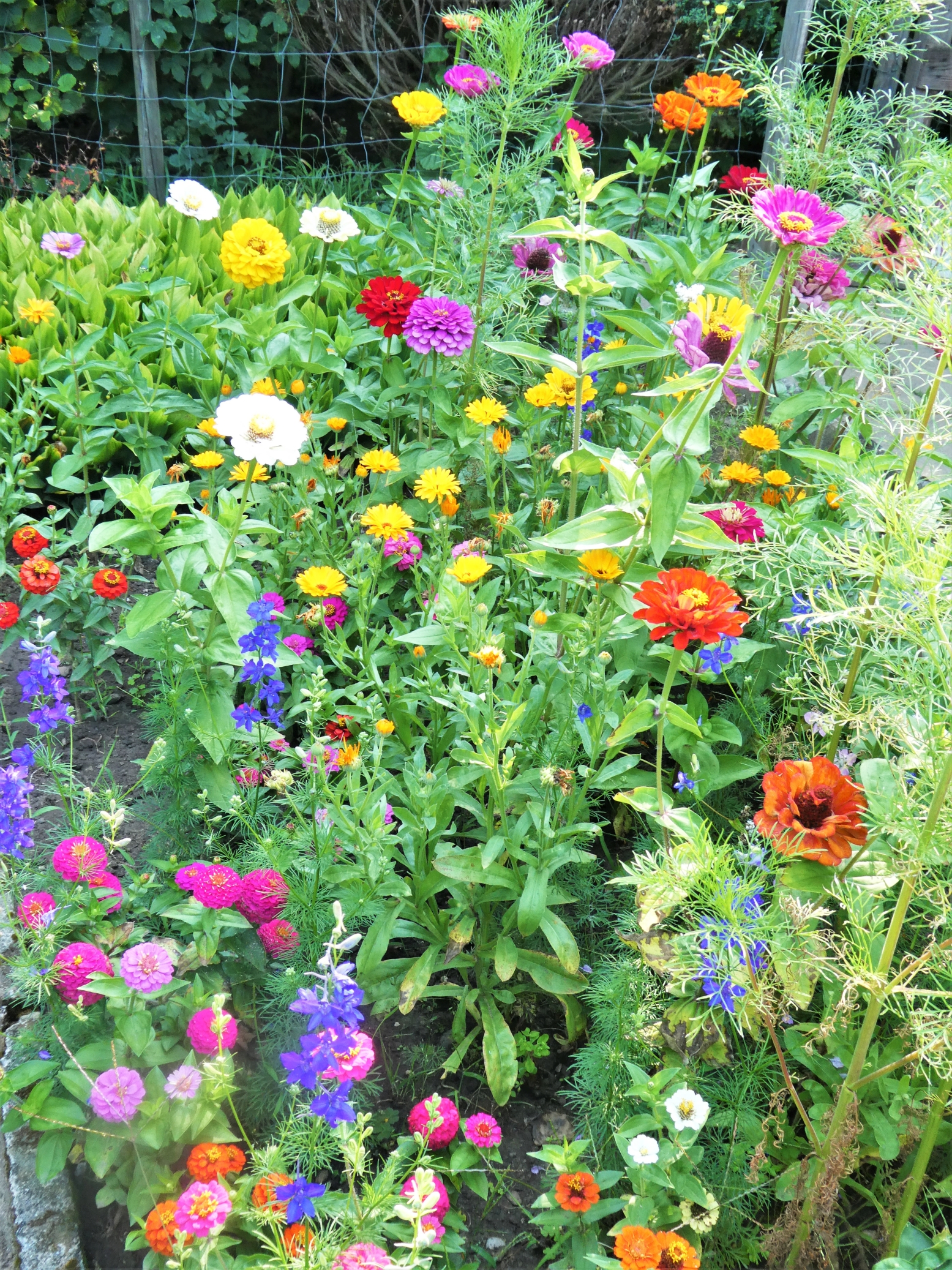 Dieses Jahr säte ich das erste Mal kleine Zinnien und wollte eigentlich einen ganzen Streifen am Beetrand. Wie gut, dass sich da Ringelblumen und wilder Rittersporn selbst versamt haben.