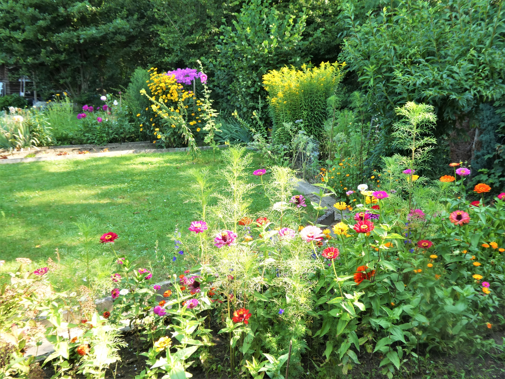 Von den Zinnien, die ich dieses Jahr gesät habe, sind nicht so viele zum Blühen gekommen wie andere Jahre. Zum Glück füllen die Cosmeen, die alle selbst gekeimt sind, wunderbar die Lücken.
