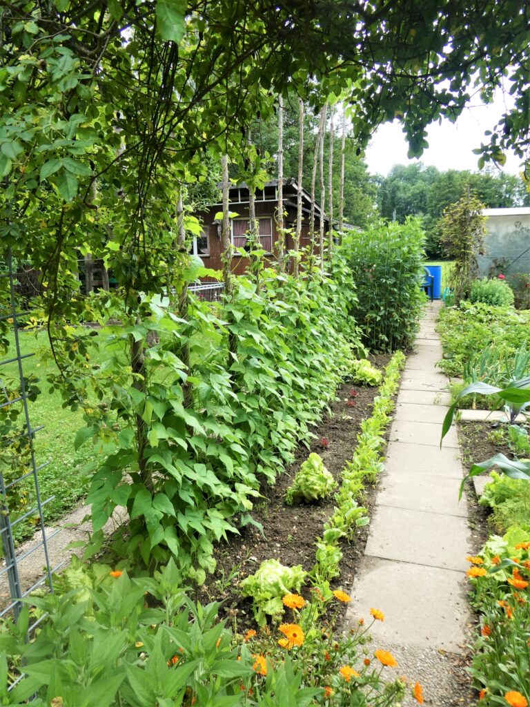Bei den Stangenbohnen nehme ich die Sorte „Berner Landfrauen“, diese wachsen bei uns besonders gut. Wir ernten die Bohnen noch jung, dann haben sie keine Fäden und sind schnell gerüstet.