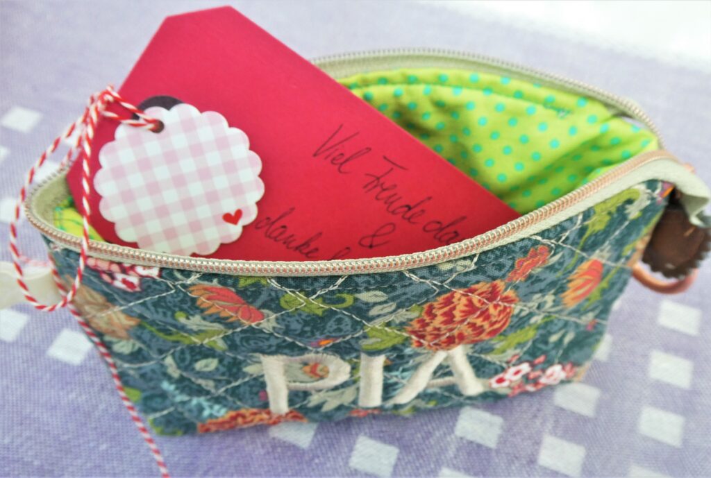 Das Täschchen ist mit einem schönen, kontrastreichen Innenstoff gefüttert. Gestaunt habe ich über den Reissverschluss. Ich habe noch nie so einen Reissverschluss gesehen, geschweige denn selbst eingenäht. Das nützliche Geschenk kam wie gerufen in dieser aussergewöhnlichen Zeit. Da wir jetzt alle Masken tragen müssen, kann ich meine Masken und Desinfektionsfläschchen schön sauber und übersichtlich darin aufbewahren.