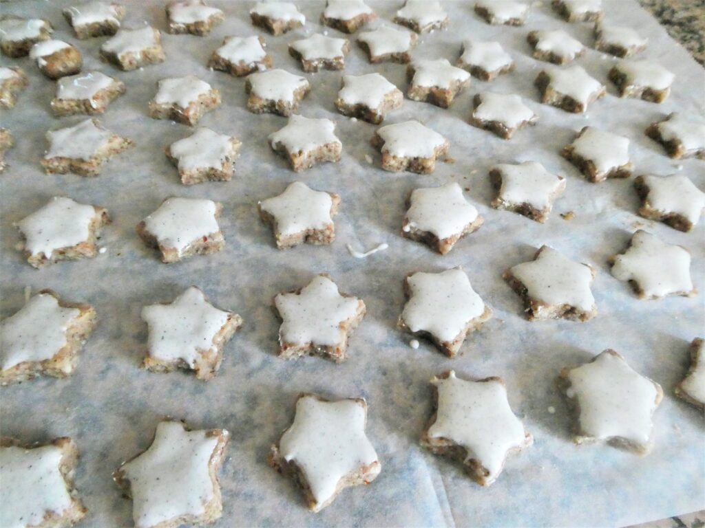 Neben den altbewährten Keksen haben wir dieses Jahr auf Wunsch auch Zimtsternen gemacht. Ich mache Zimtsterne nicht so gerne, weil sie so klebrig sind. Ich hoffe, sie kommen gut an.