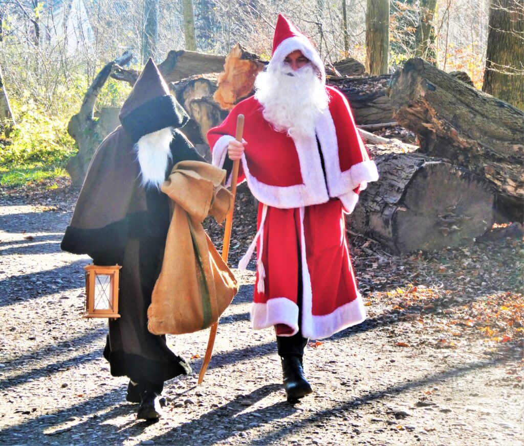 Was für ein Zufall! Im Wald sind wir diesem Paar begegneten. Ist es eventuell doch wahr, dass der rote, bärtige Mann mit seinem Gehilfen im Wald wohnt? Hach, war das eine schöne Begegnung und bereicherte unseren Spaziergang. Die Kinder warteten im Wald auf den „Samichlaus“ und den „Schmutzli“ wie sie bei uns heissen.
