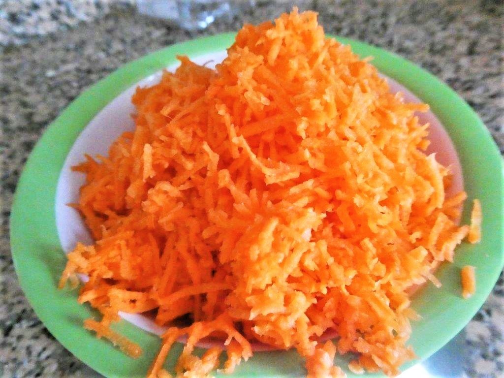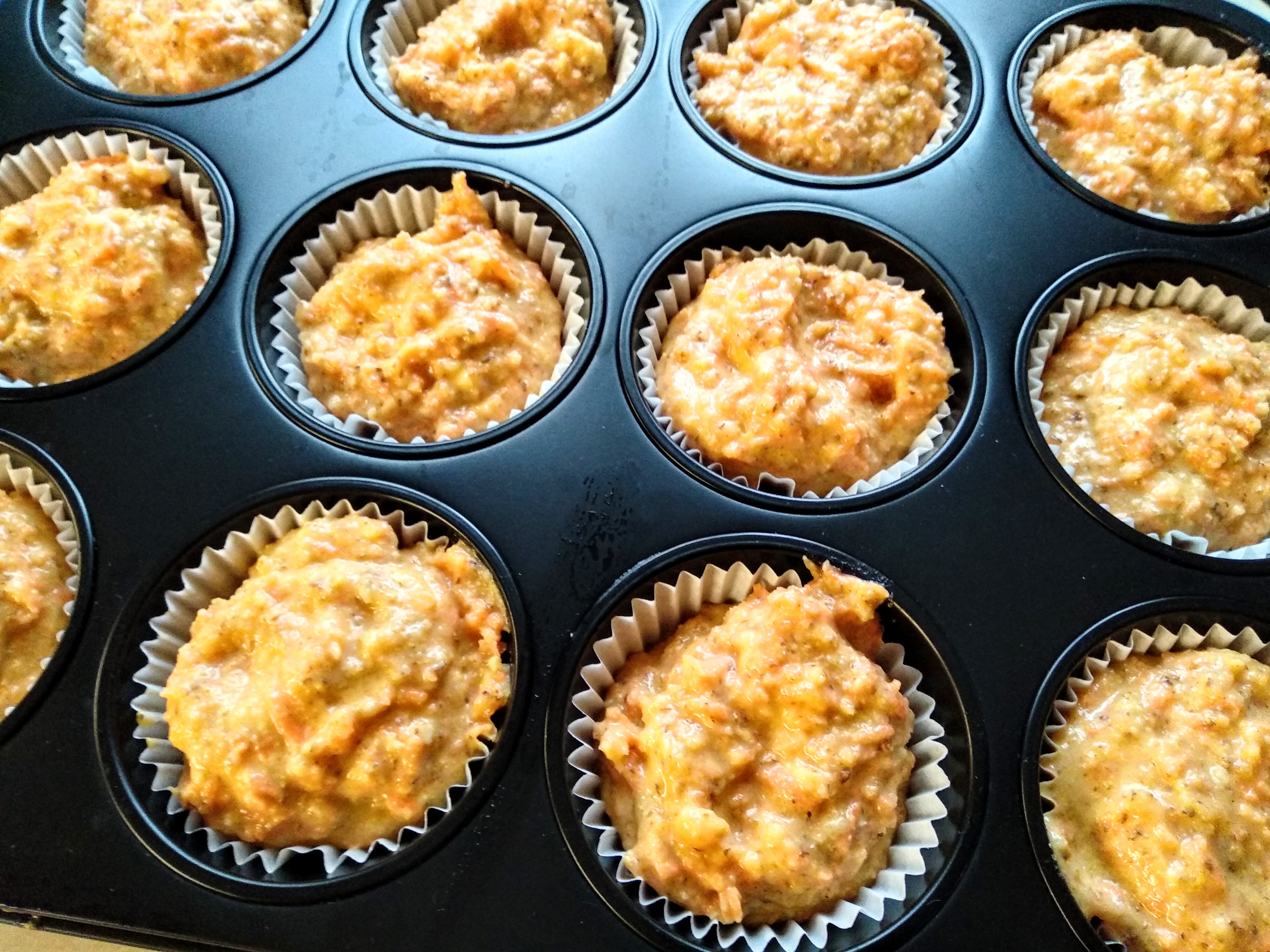 Ich backe gerne Muffins, besonders jetzt in dieser schwierigen Zeit, wenn wir zwei alles alleine essen müssen. Für die Rüebli-Muffins, so heissen die Karotten in der Schweiz, haben wir noch genügend eigene Rüebli und sie geben den Muffins die nötige Feuchtigkeit. Für die Muffins 200 gr fein raffeln.