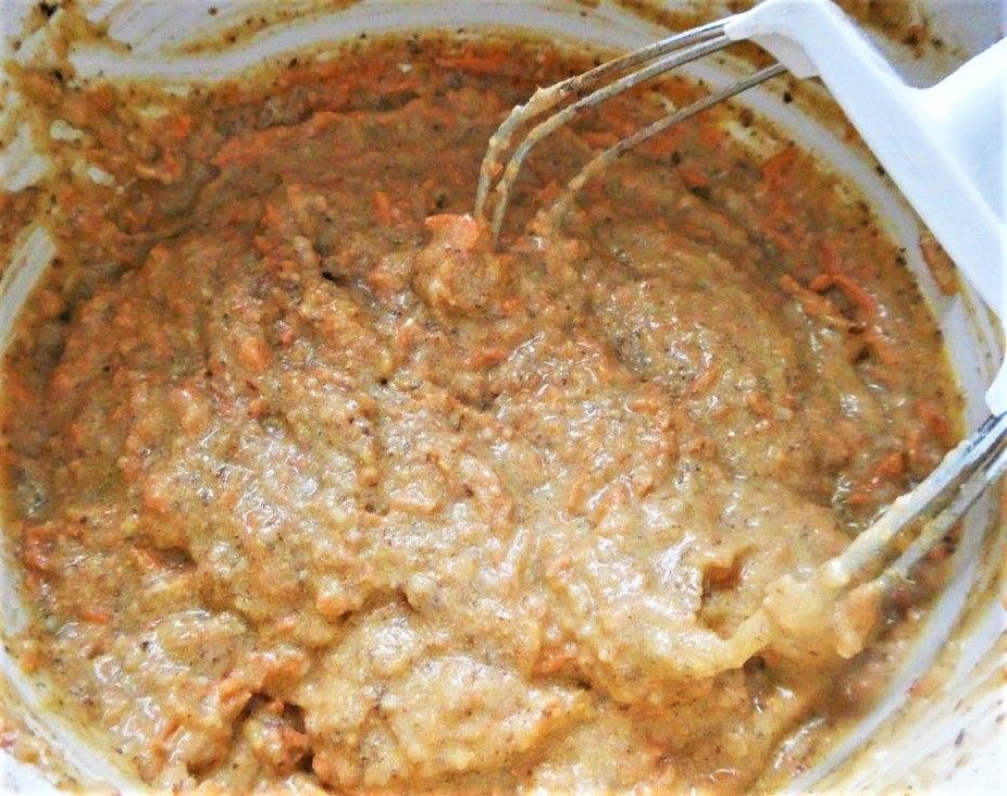 50 gr Butter, 120 gr Zucker und 2 Eier sehr schaumig schlagen. Dazu kommen die Karotten, 150 gr gemahlene Mandeln, 100 gr Mehl, 2 TL Backpulver und 1 dl Milch. Kurz umrühren und