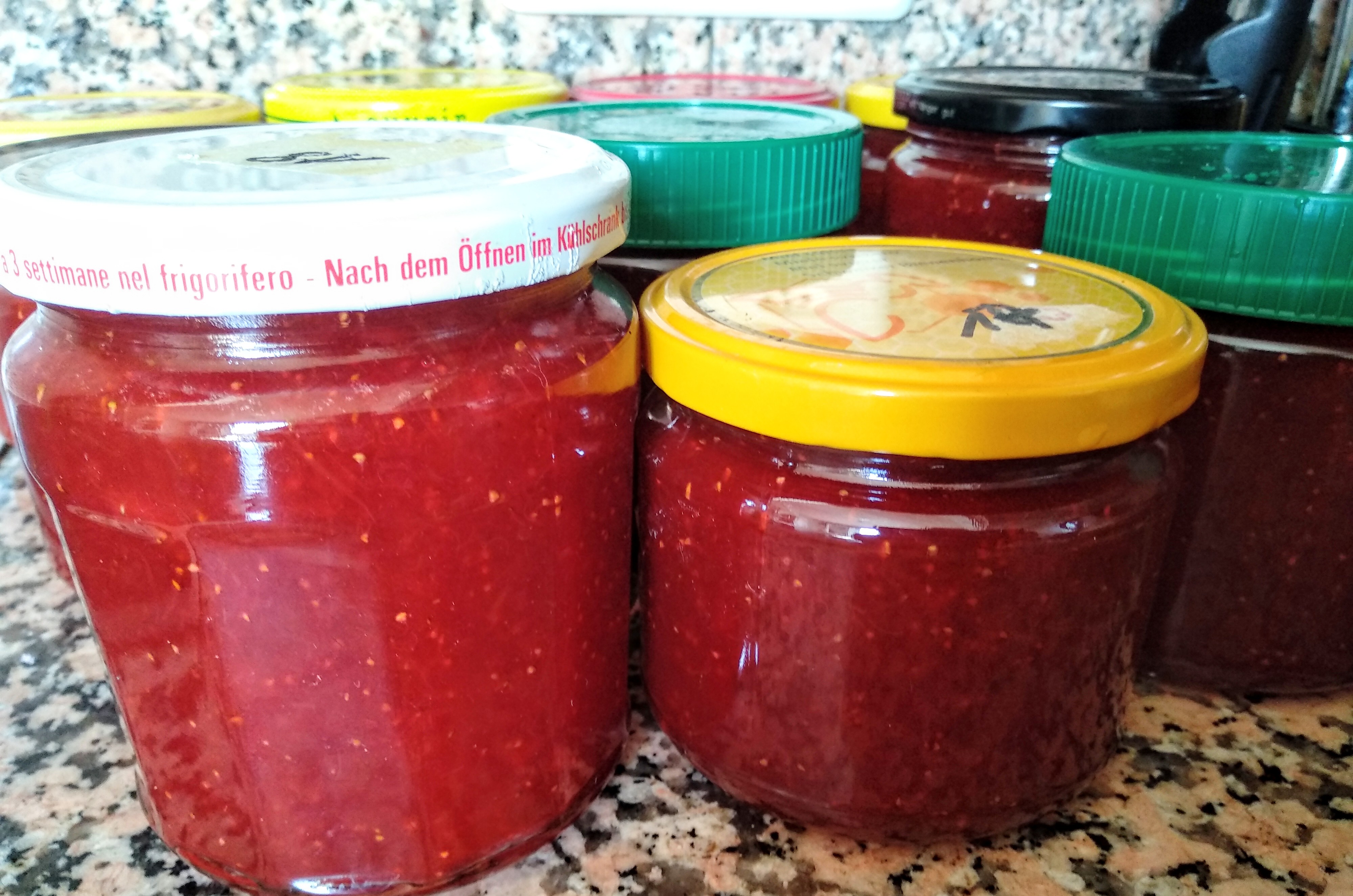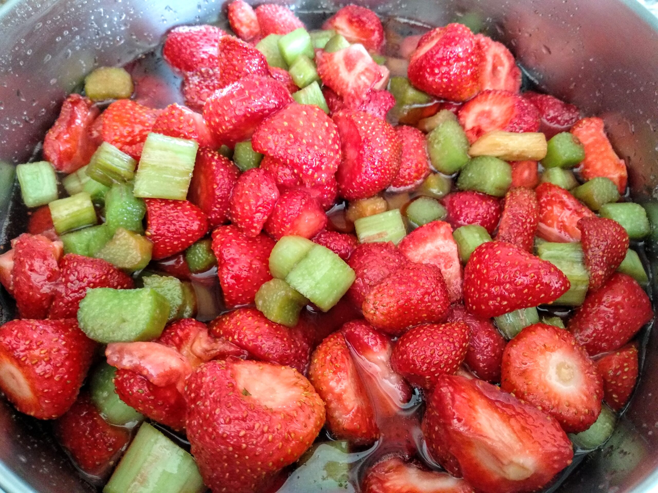 Beim nächsten Feld machten wir gleich wieder einen Halt. Auf dem Feld pflückten die Arbeiter die reifen Erdbeeren. Am Wegrand standen Kisten mit aussortierten, nicht einwandfreien Erdbeeren zum Entsorgen. Diese Früchte sind aber genau richtig zum Einmachen. Wenn man höflich fragt, darf man eine Kiste mitnehmen. Zusammen mit den letzten Rhabarbern habe ich dann zuhause frische Erdbeer- Rhabarber Marmelade gekocht.