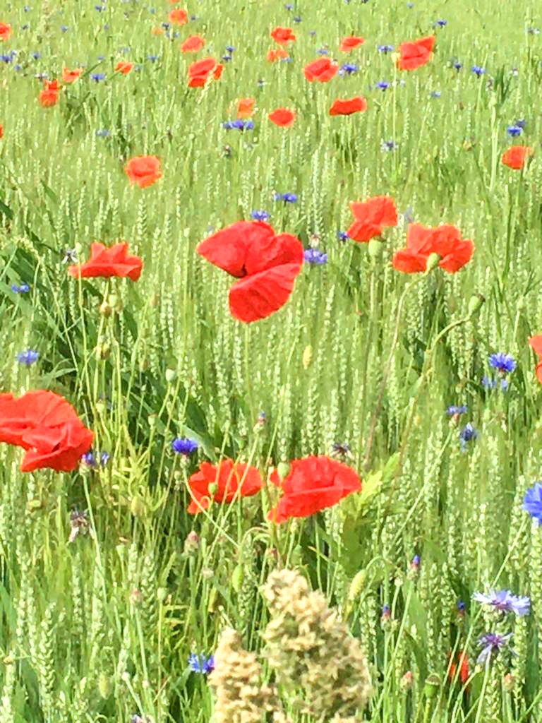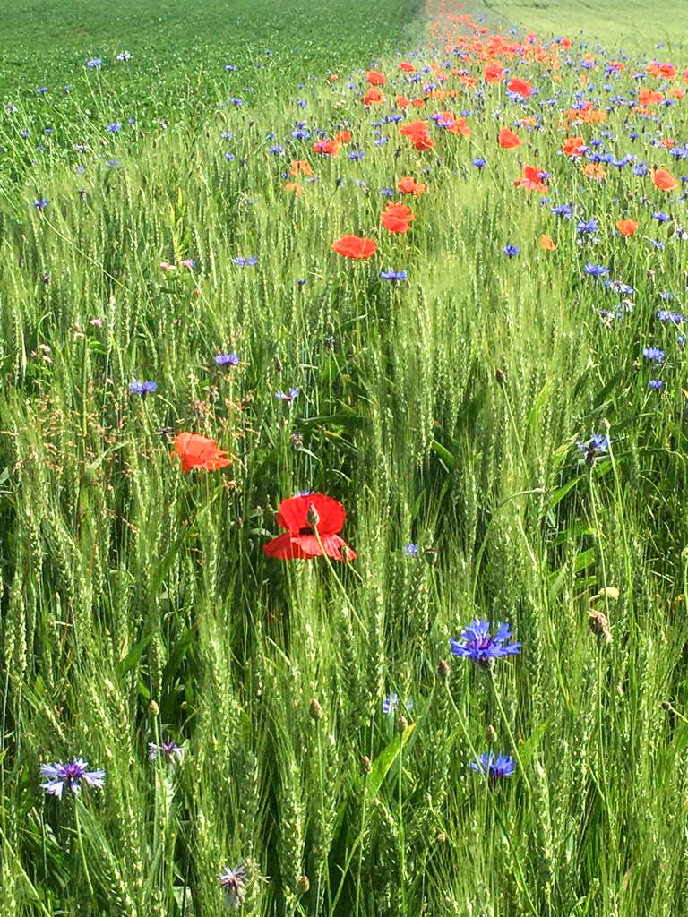 Der rote Mohn, die blauen Kornblumen und das noch grüne Korn sind eine Augenweide.