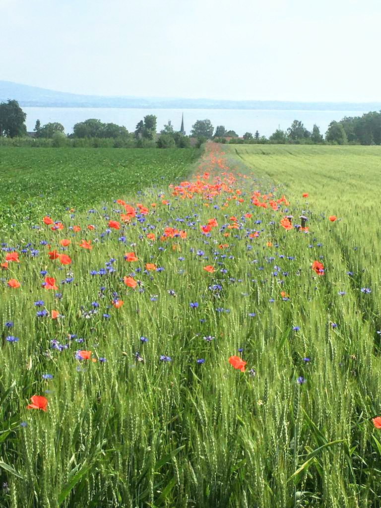 Jetzt blüht wieder der rote Mohn in den Kornfeldern. Auf unseren Radtouren rund um den Bodensee wählen wir nicht den offiziellen Radweg direkt am See, sondern fahren lieber auf dem Weg, der mehr im „Landesinneren“ ist. Dieser ist weniger befahren und die Aussicht ist auch viel schöner.