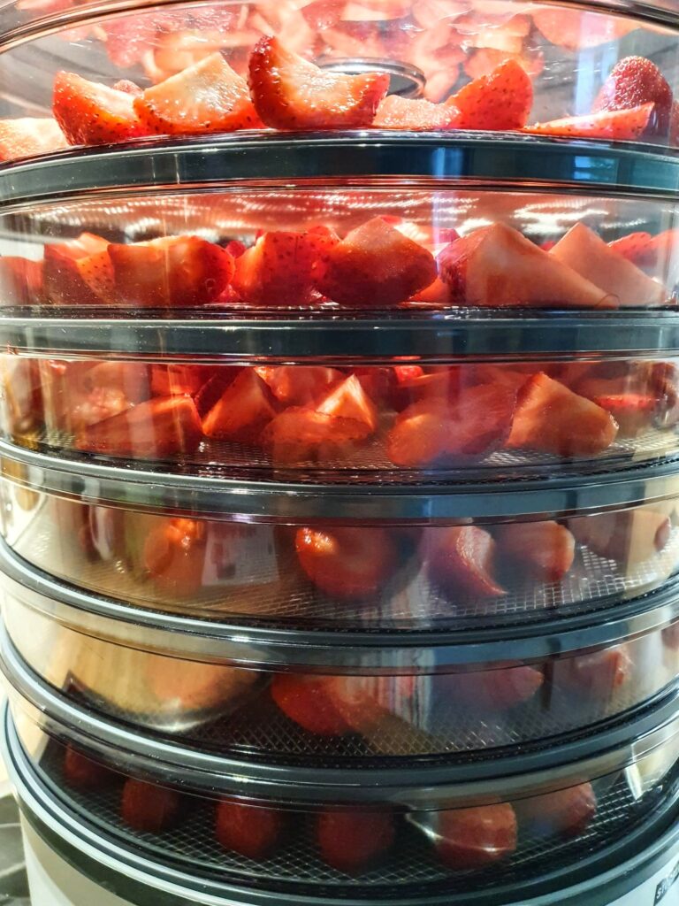 Über Nacht wurden im Dörrgerät die restlichen Erdbeerstücke getrocknet, was auch eine wunderbare Nascherei gibt.