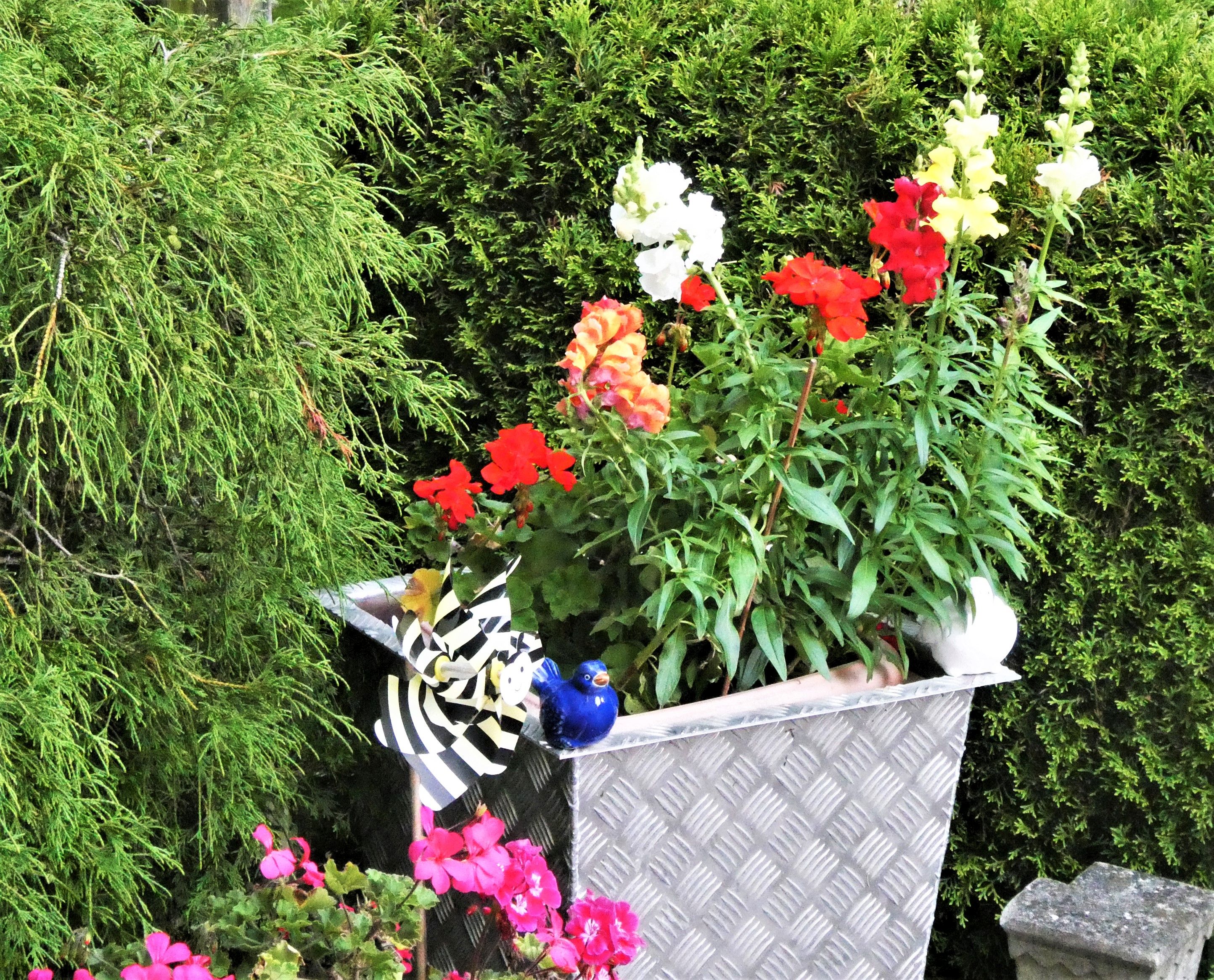 Zum ersten Mal setzte ich dieses Jahr in den Blumenkästen Löwenmäulchen und sie gedeihen wunderbar. Sie gehören zu meinen Lieblingsblumen. Im Frühsommer steckte ich ein paar Setzlinge einfach zu den Geranien in den Topf. Und nirgends sonst im ganzen Garten gedeihen sie so schön wie hier wo sie die Geranien verdecken.