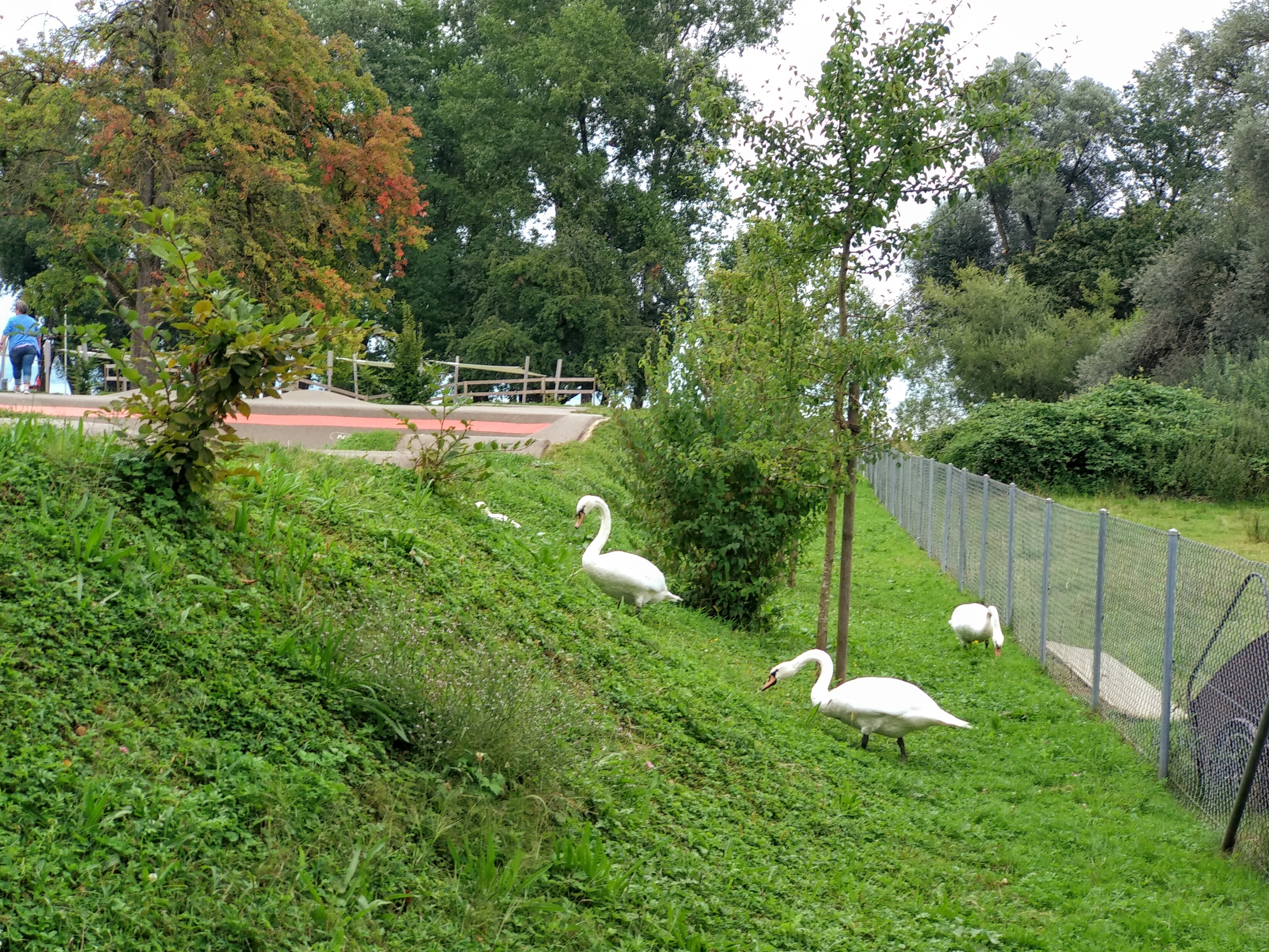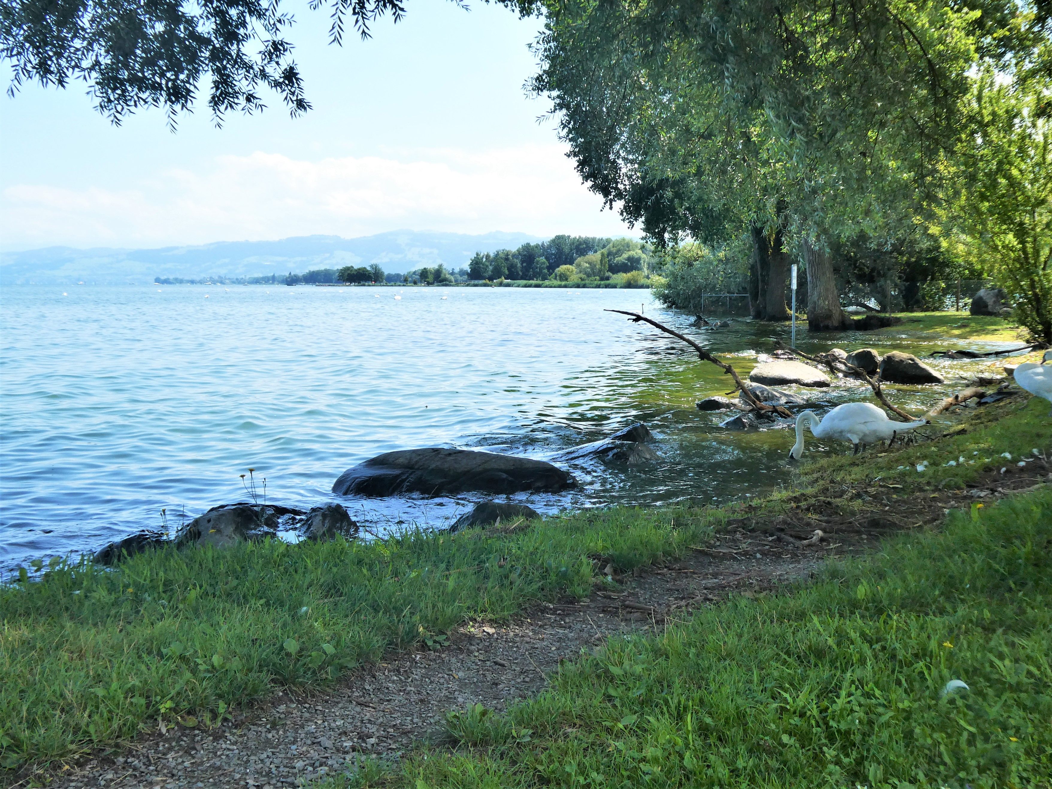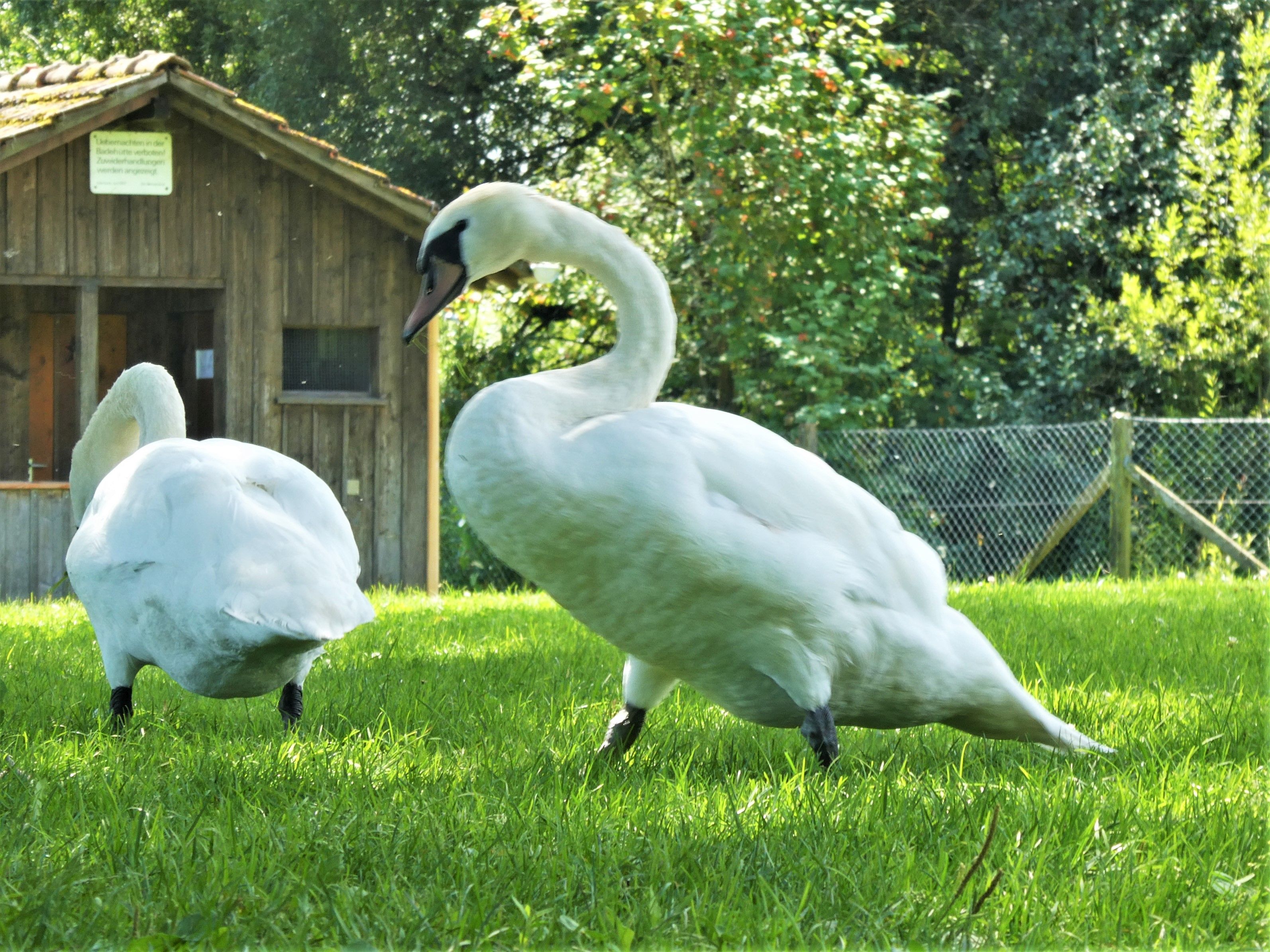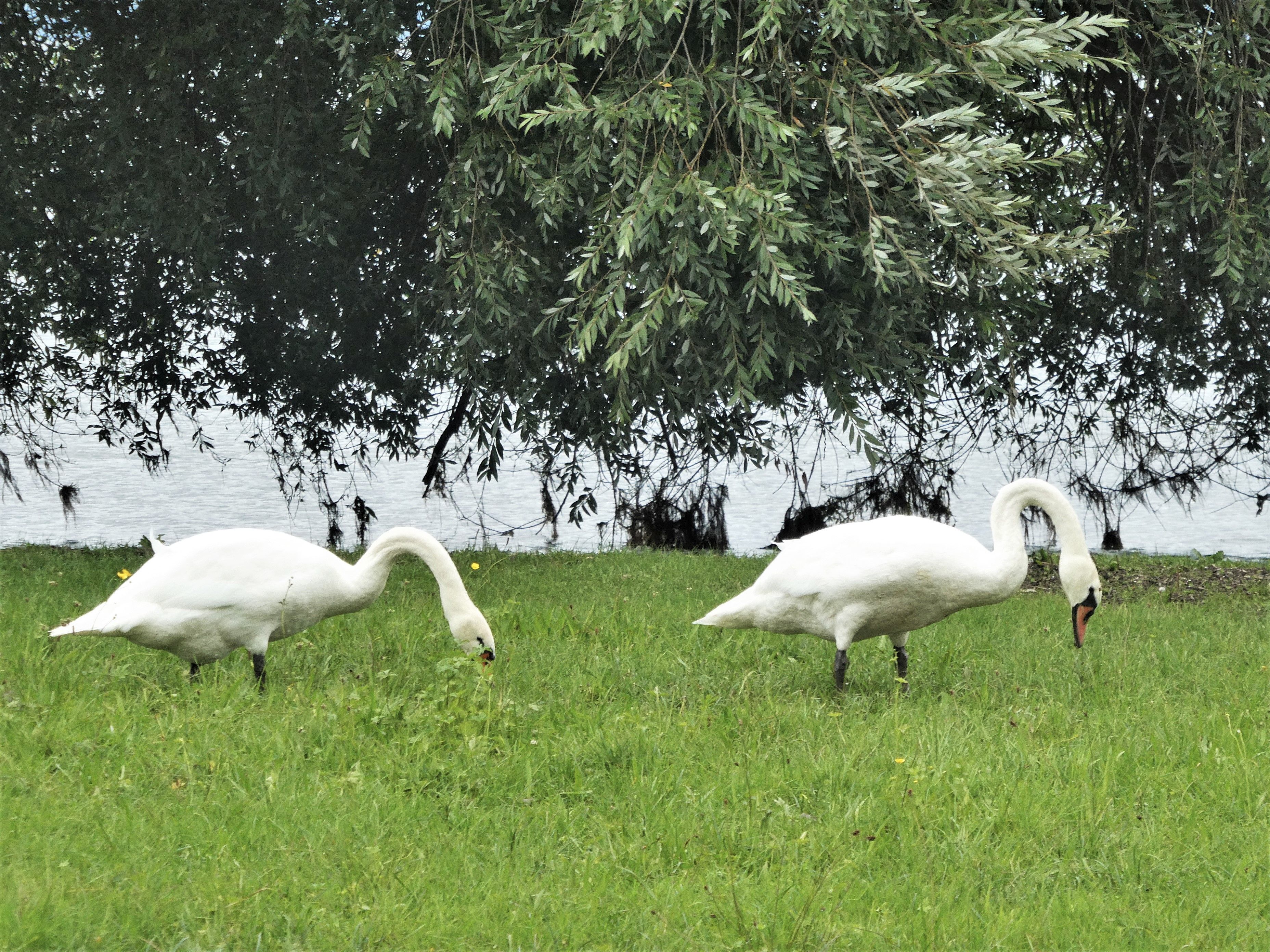 Die Wiese gehört eigentlich den Badegästen und nicht den Schwänen. Aber in diesem nassen Sommer sind die Badenden nicht so zahlreich, und dafür sind nun die Tiere auf der Wiese. Zum Leidwesen vieler, fressen sie nicht nur, sondern hinterlassen auch überall ihre Kothaufen. Da muss man aufpassen beim Laufen.