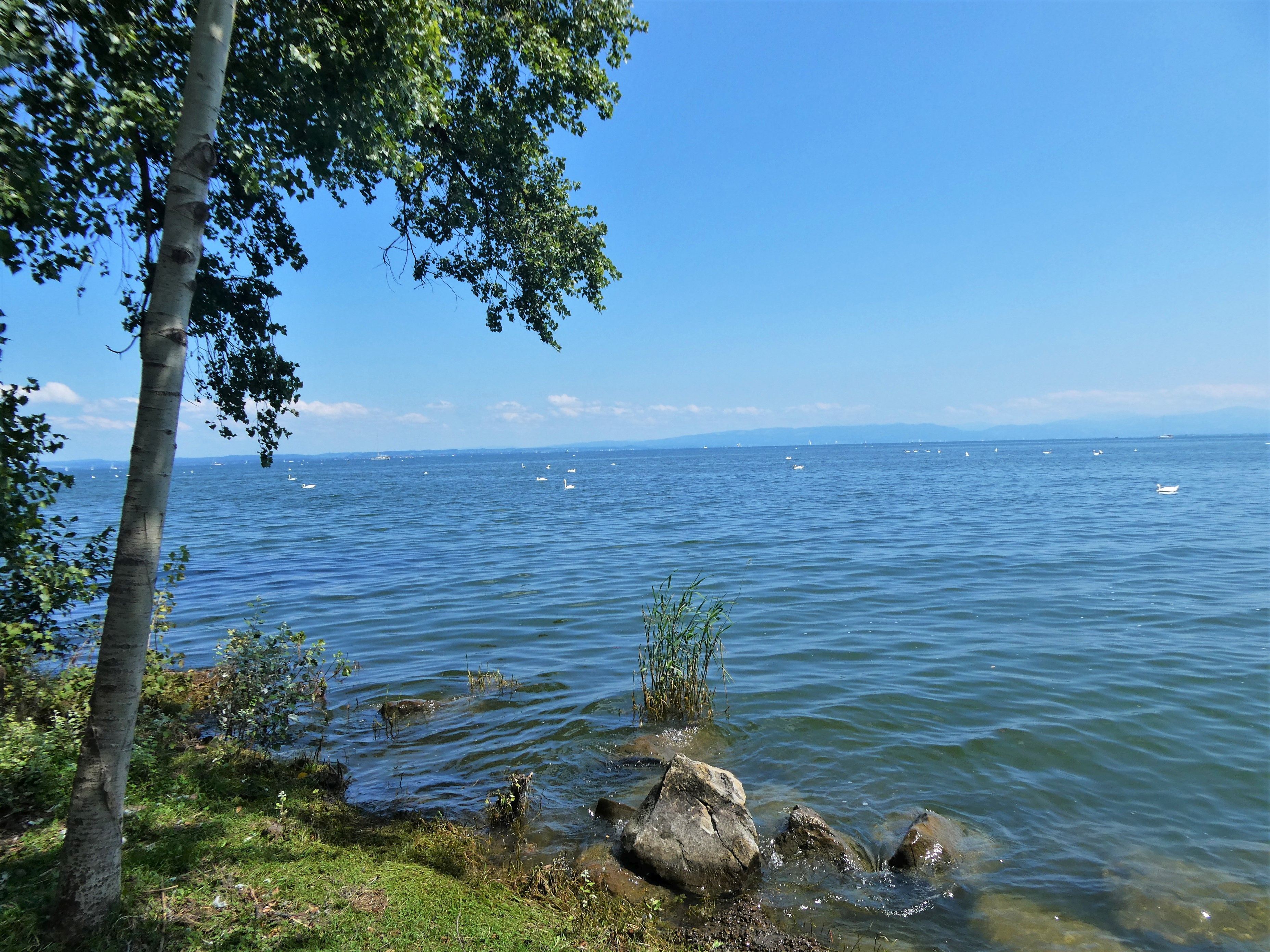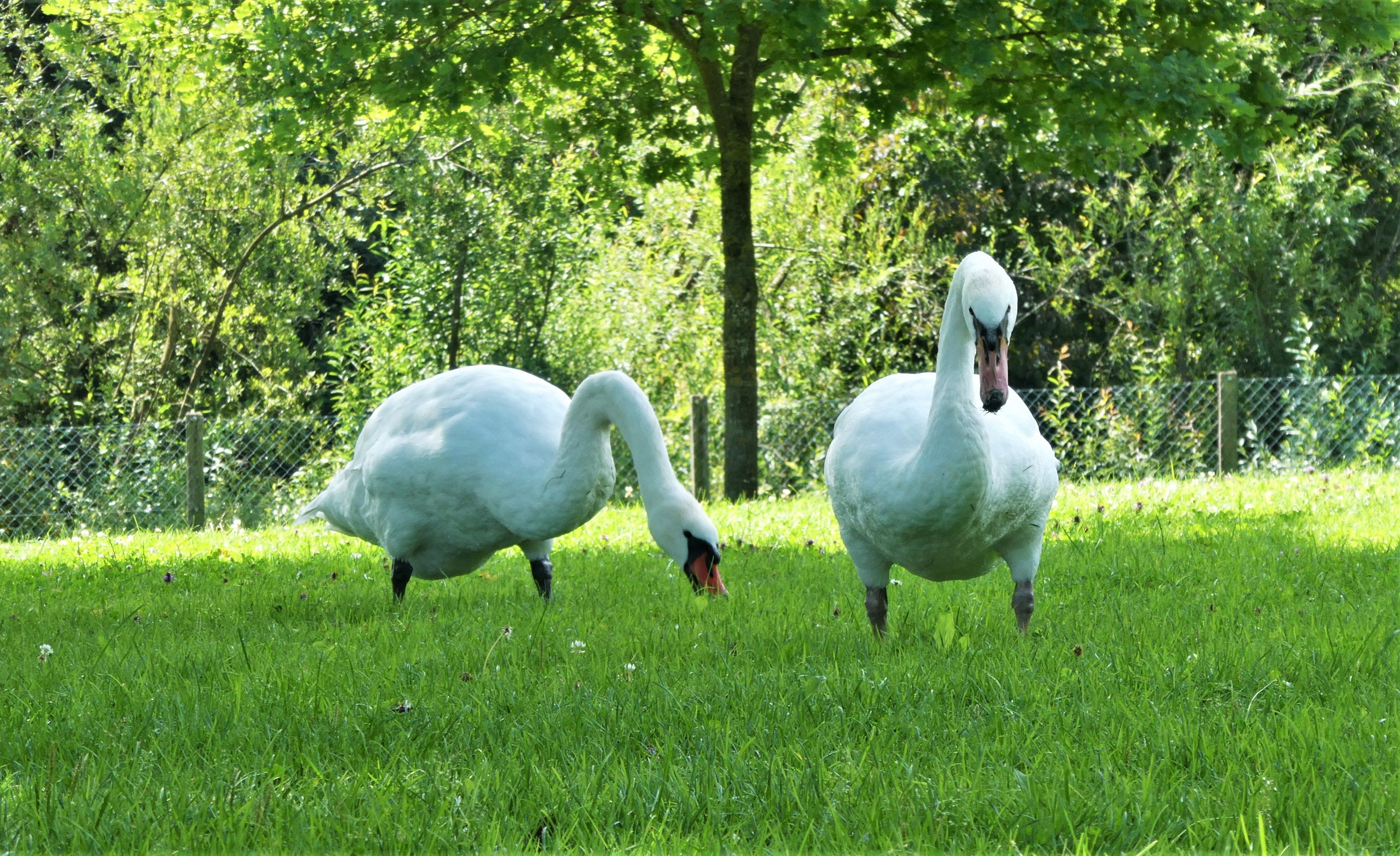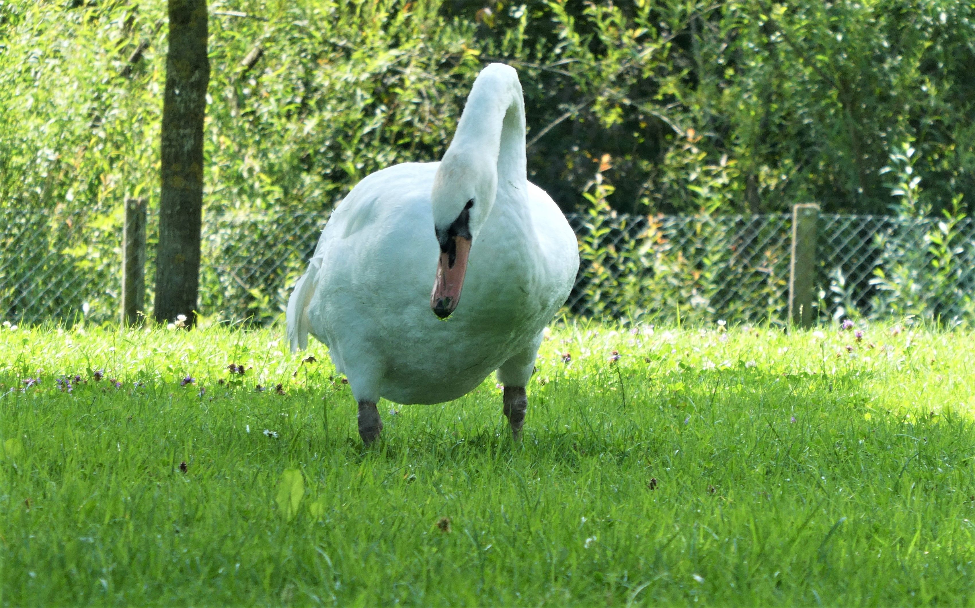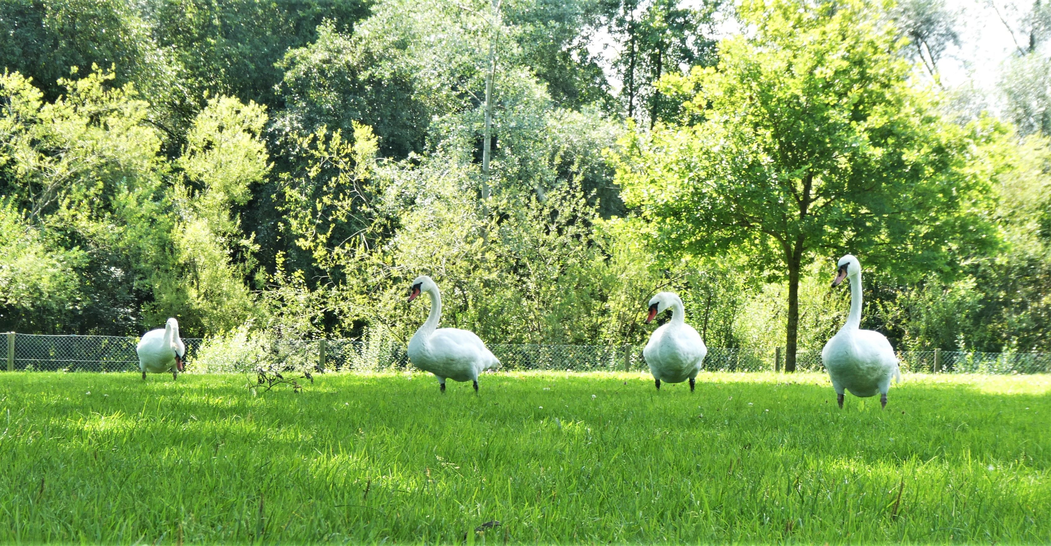 Die Wiese gehört eigentlich den Badegästen und nicht den Schwänen. Aber in diesem nassen Sommer sind die Badenden nicht so zahlreich, und dafür sind nun die Tiere auf der Wiese. Zum Leidwesen vieler, fressen sie nicht nur, sondern hinterlassen auch überall ihre Kothaufen. Da muss man aufpassen beim Laufen.