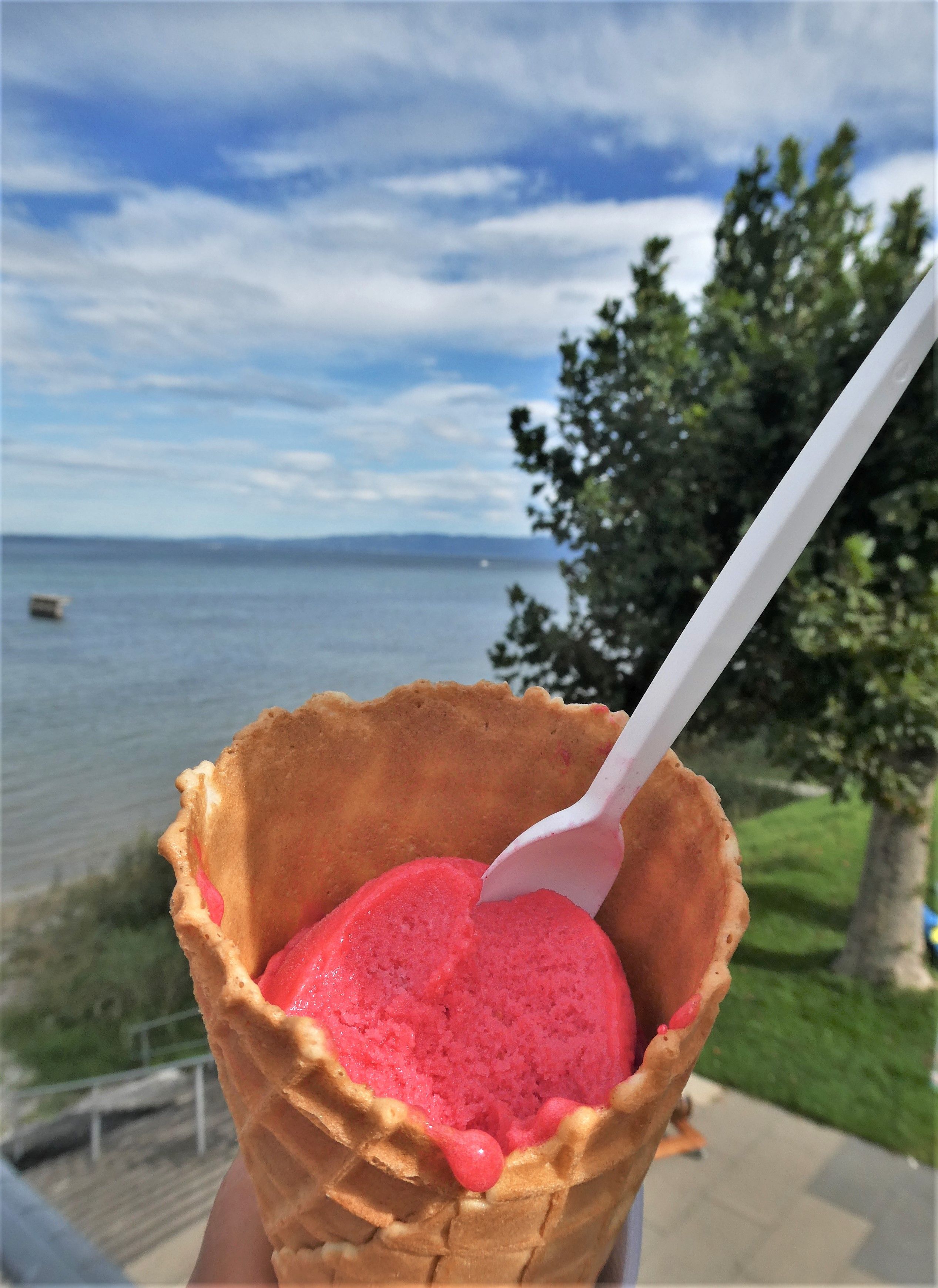 Im Sommer ist in dieser Bucht viel los, die Leute picknicken und grillieren. Jetzt hatte ich die Bucht fast für mich alleine und ich genoss wahrscheinlich mein letztes Glacé im Freien.