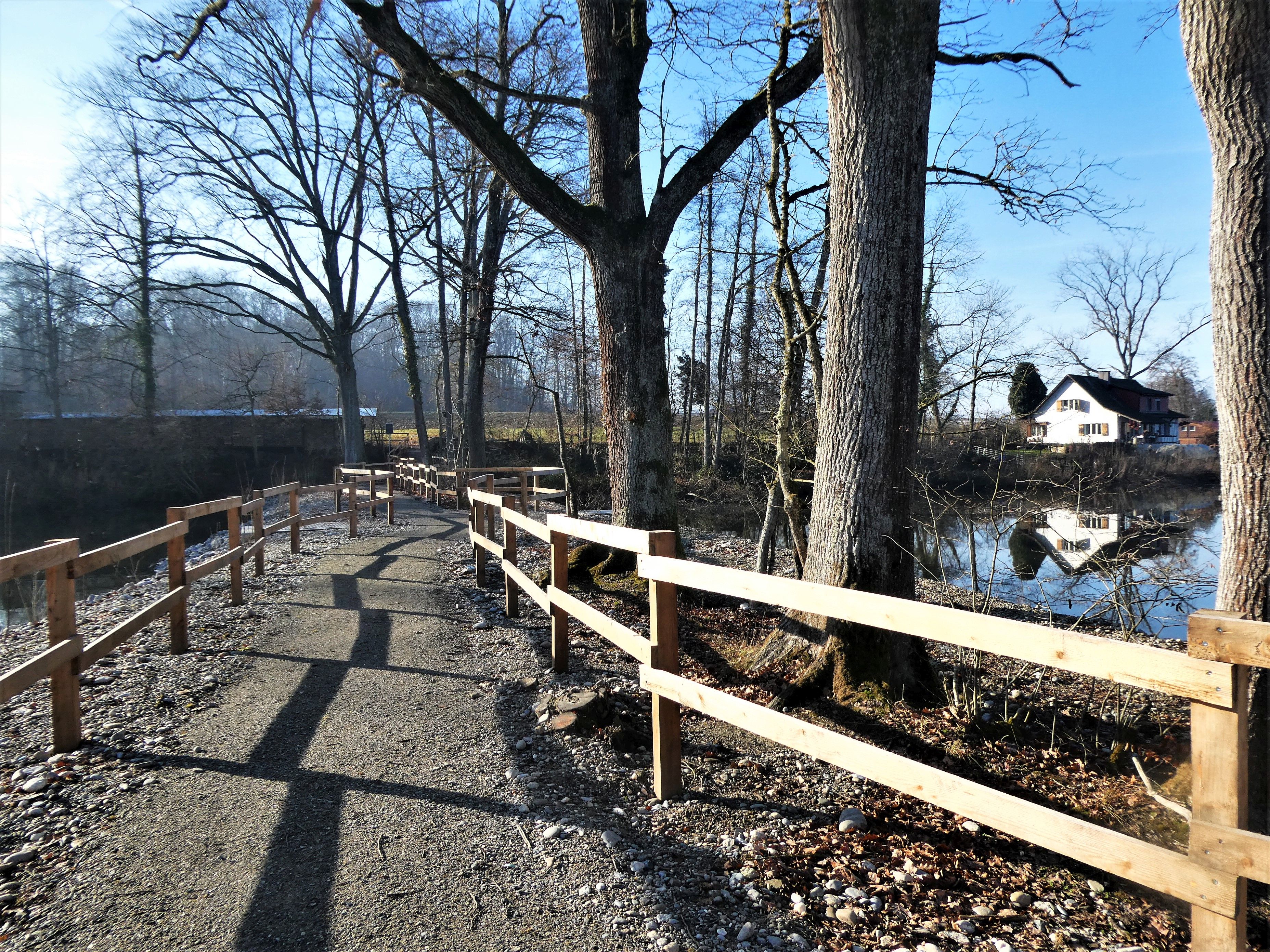 Der Damm ist nun breiter und ein Geländer schützt das Ufer. Leider fehlt die Sitzbank in der Mitte, dafür kann man sich schön Anlehen am neuen Geländer und die Natur im Wandel der Jahreszeiten geniessen.