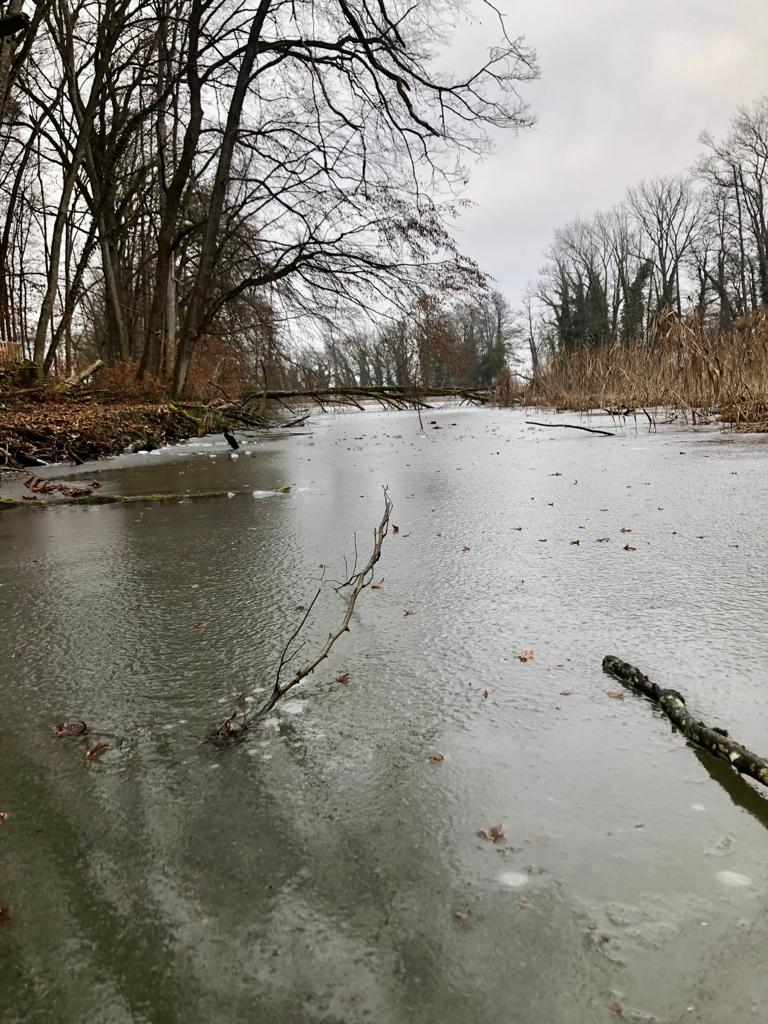 Aktuell macht der Eisweiher seinem Namen alle Ehre, es hat sich eine dünne Eisschicht gebildet.