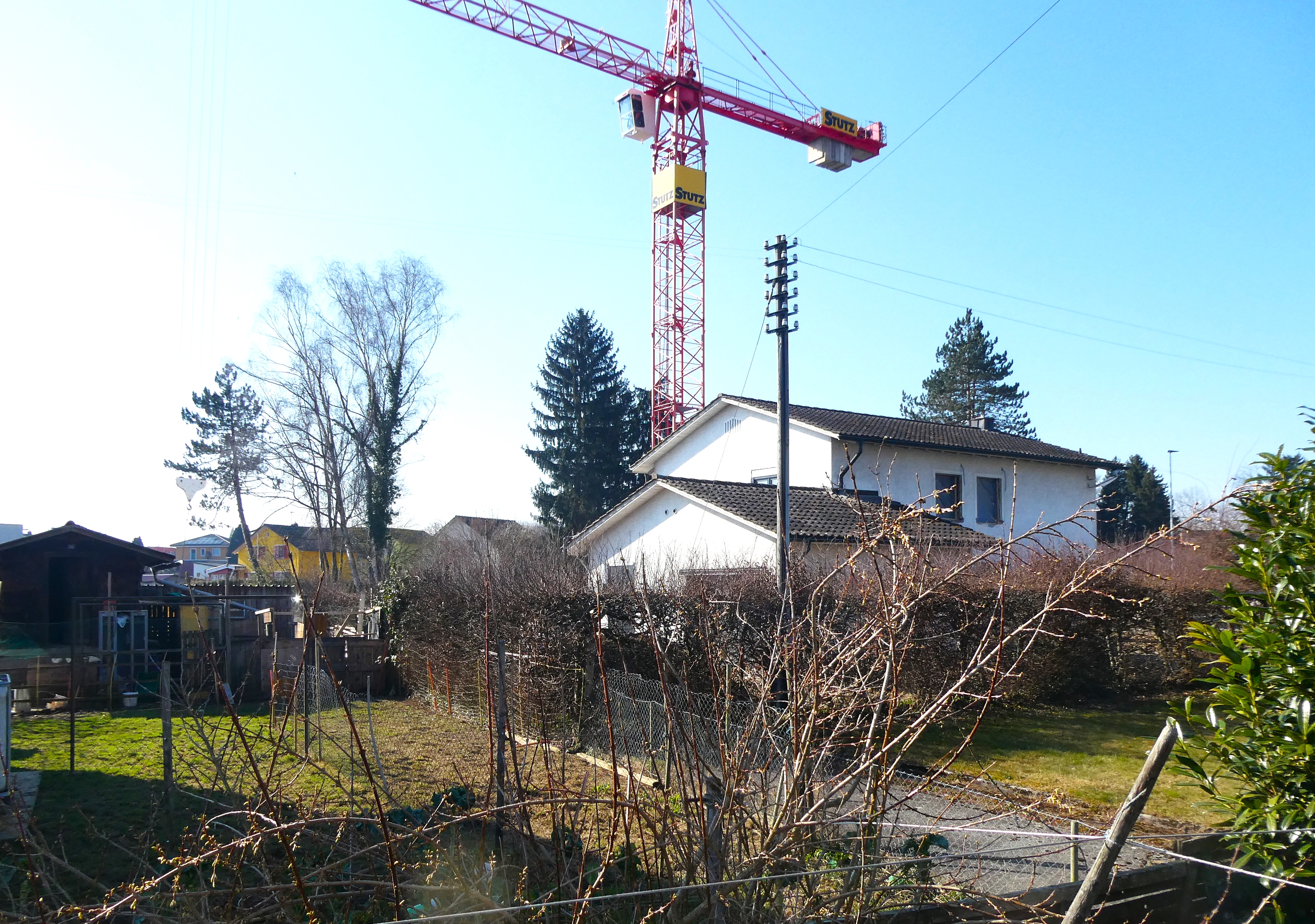 Auf der Baustelle nimmt das Haus immer mehr Gestalt an und seit Anfang des Monats steht auch ein grosser Kran, der fleissig Beton an den richtigen Ort hievt. Für kurze Zeit können wir die anderen Häuser hinter der Baugrube sehen. Bis vor kurzen wurden sie von hohen Tannen verdeckt, ab nächstem Jahr werden wohl die neuen Wohnungen die Sicht verdecken. Momentan entsteht noch die Tiefgarage.