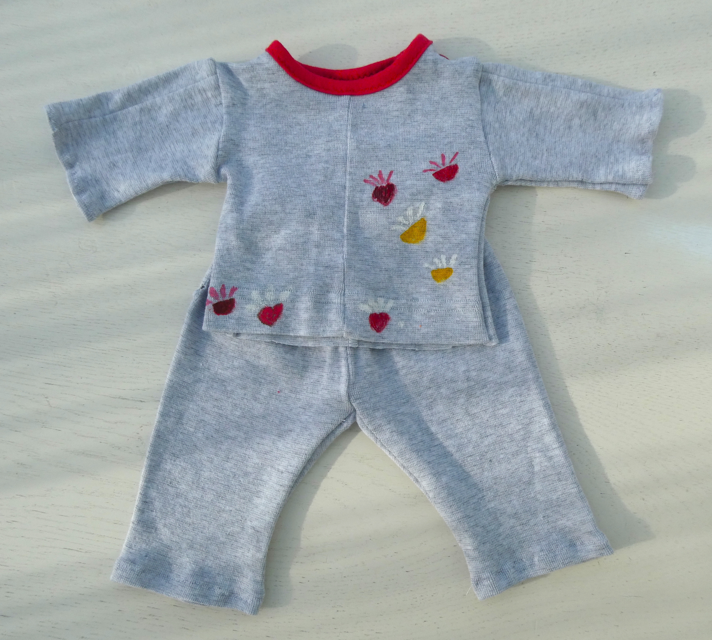 Im Februar nähte ich aus einem alten, kaputten Shirt einen Pullover für die Enkelin. Ich hatte die Stoffreste noch nicht entsorgt und so entstand aus einem Probestück noch ein Puppenpullover. Mit Stoffmalfarben wollte ich zuerst den Pullover für die Enkelin verzieren, habe mich dann aber für das Nähen eines Herzens entschieden. Ist wohl besser, wenn ich vorerst meine Malversuche an den Puppenpullover ausprobiere.